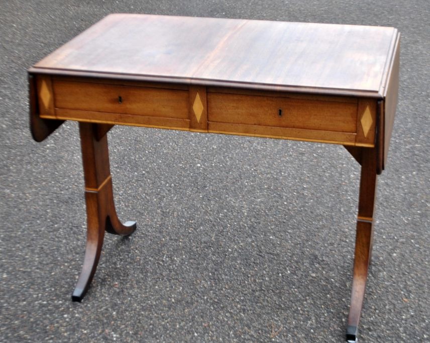 Arbejdsbord med klapper i mahogni med intarsia, ca. 1900. Danmark.
