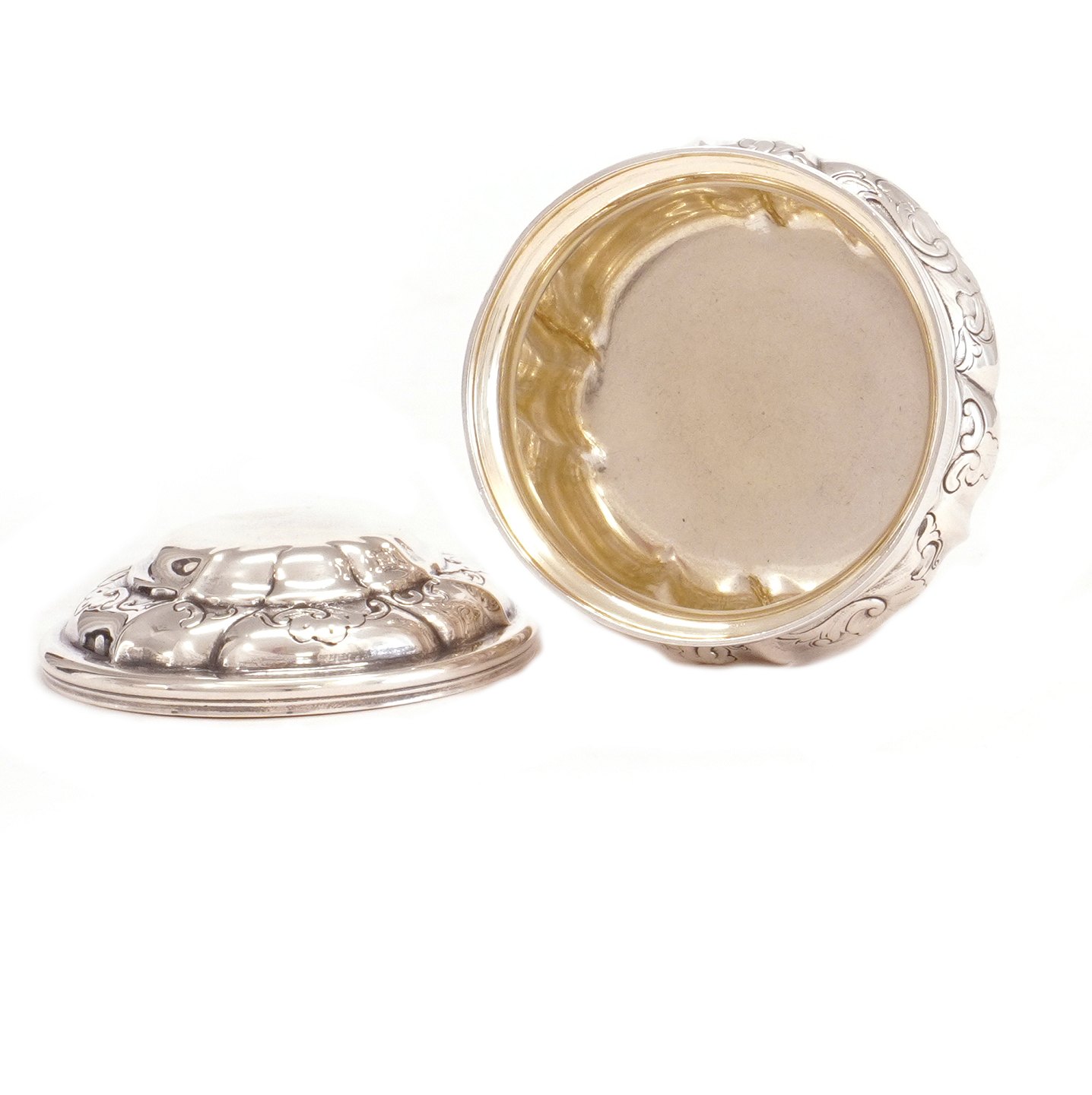 Kraftig lille sølv bonbonniere af A. Michelsen, København, dateret år 1900. Indvendigt forgyldt. H: 7cm. V: 155gr
