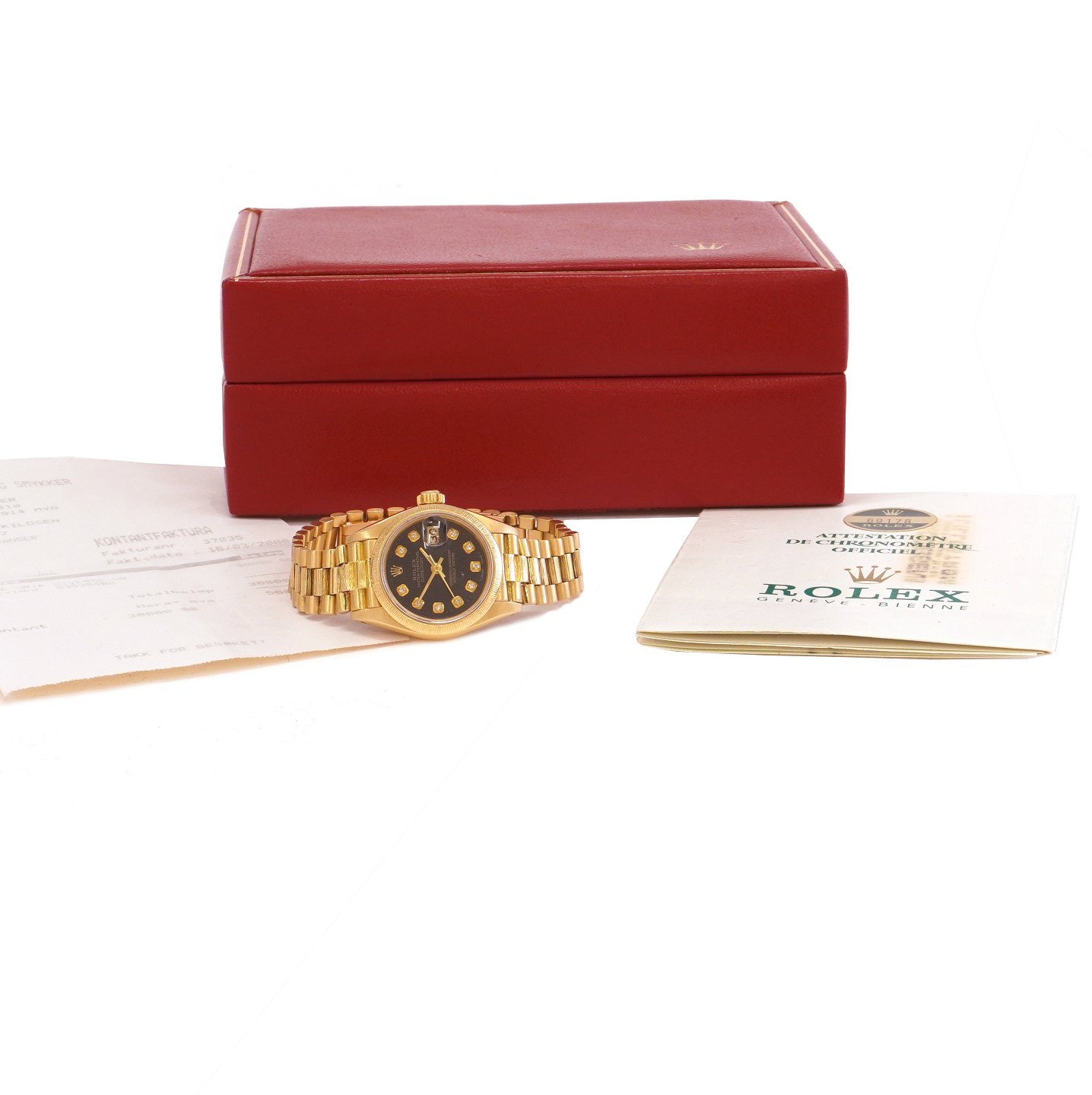 Rolex Oyster Perpetual Datejust ref. nr 69178 i 18kt guld og sort skive med diamanter som timemarkører. D: 26mm. Leveres med boks, certifikat og købskvittering. Solgt første gang 23/12 1985
