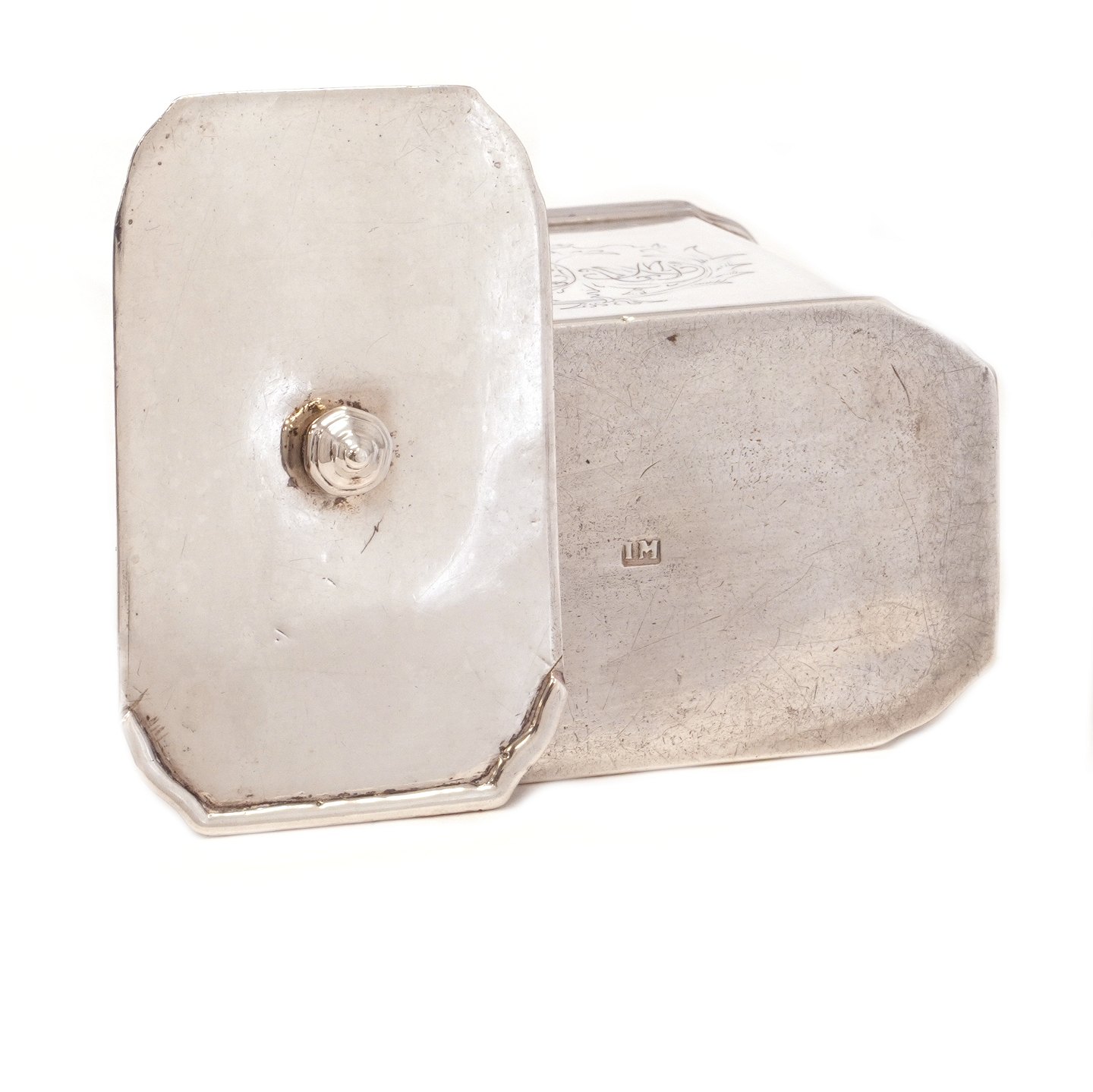 Sjælden Regence tedåse med skydelåg i sølv udført af Johan Mehl, Viborg, 1725-65. H: 8cm. B: 7,7cm