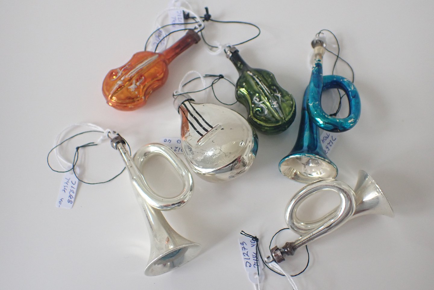 6 stk. glasjulepynt med ophæng. 5 tyske og 1 russisk mandolin. 1930 - 1940. 2 Violiner. Længde: 6,5 - 7 cm. Pris 150 kr. pr. stk. 3 trompeter: Længde: 6 - 7,5 cm. Pris: 200 kr. pr. stk. 1 mandolin. Længde: 6 cm. Pris: 80 kr.