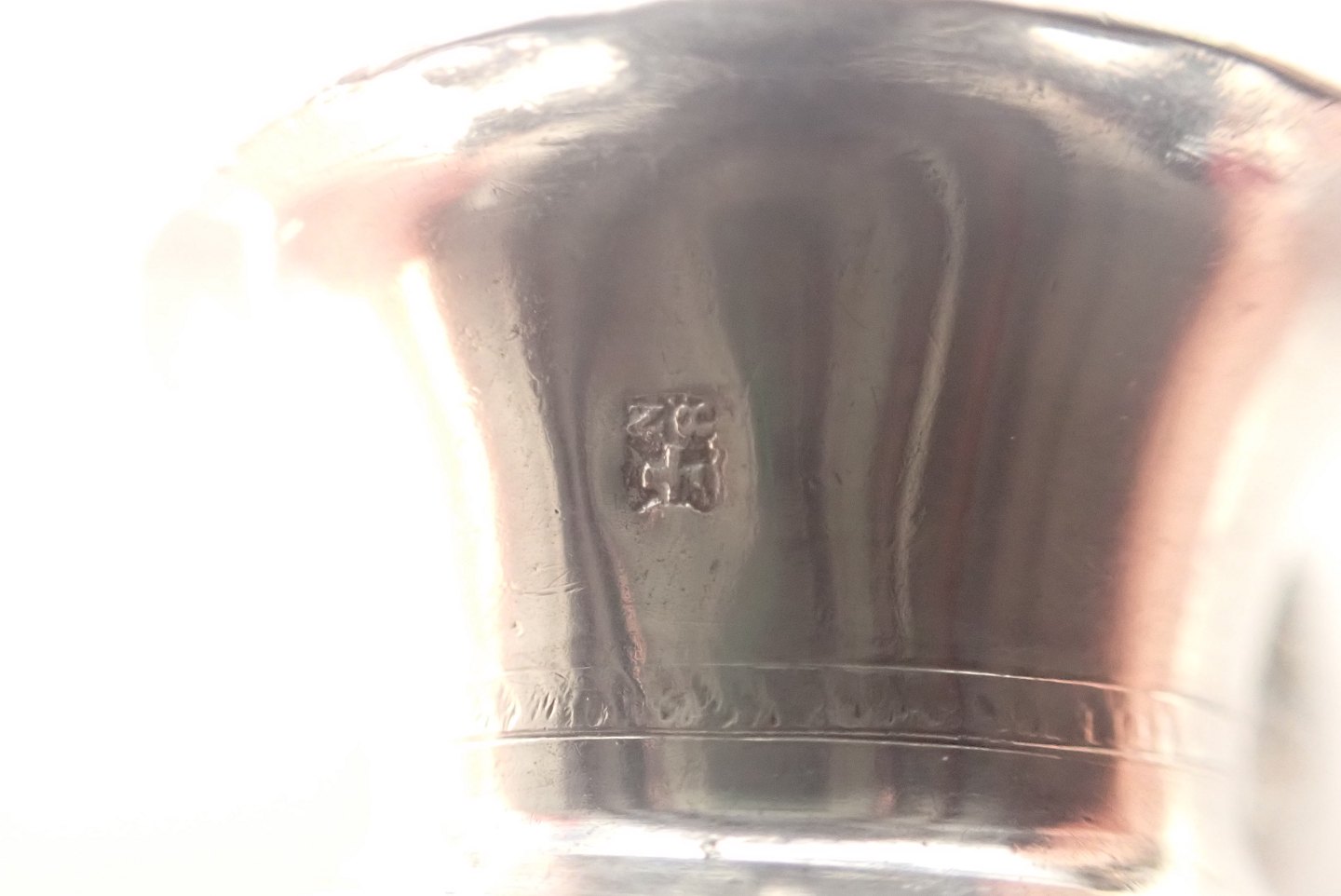 Russisk miniature vodka kop i sølv med mønsterdekoration 1800-tallet. Stempel ukendt 8,z ? og et kors. Højde: 4 cm. Diameter kop foroven u hank: 4,2 cm. Med hank: 5,5. I fin stand med tidstypisk slid. Vægt: 16,6 gram.