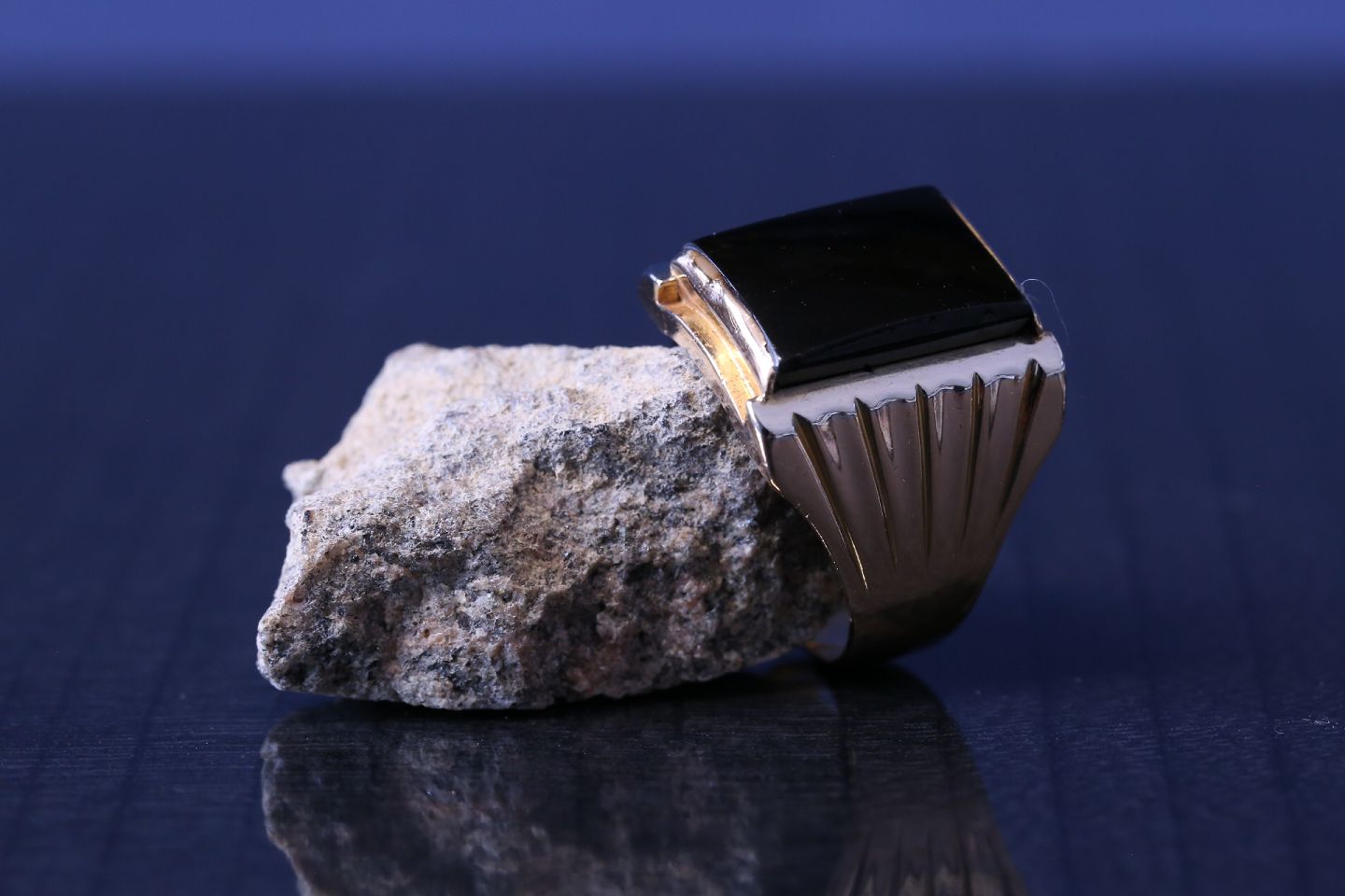 Beautiful men's ring in 18 carat gold, with beautiful black onyx. The design of the ring expresses strength and elegance. Therefore, this men's ring is a good choice for the mature man. The ring's beautiful large onyx gives dynamics and emphasizes the strength of the ring.