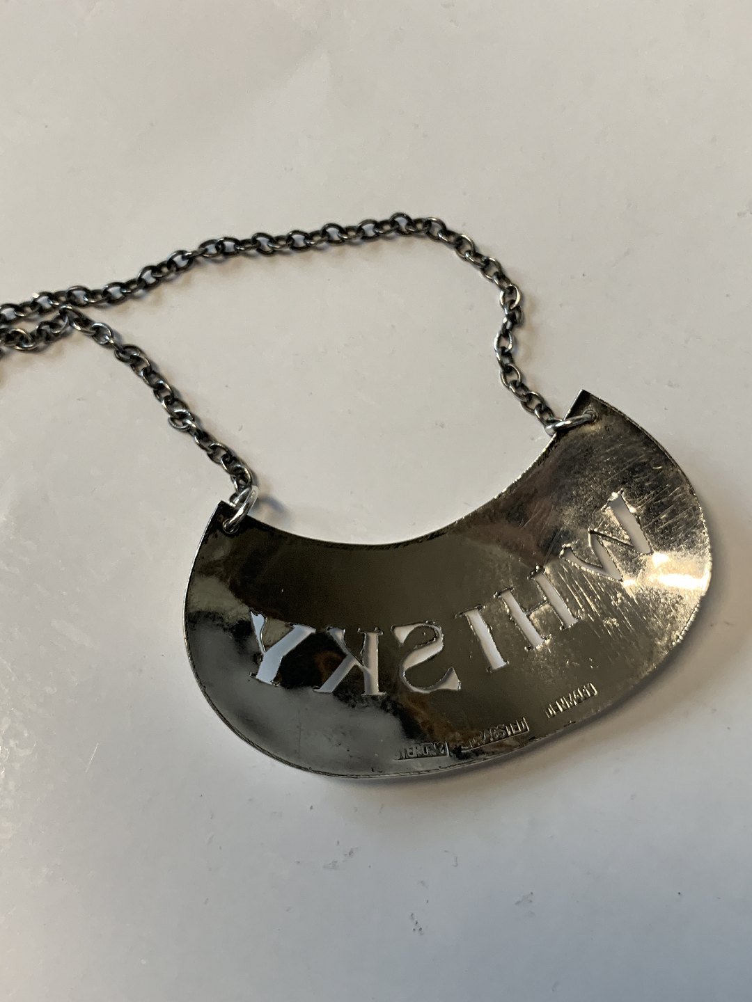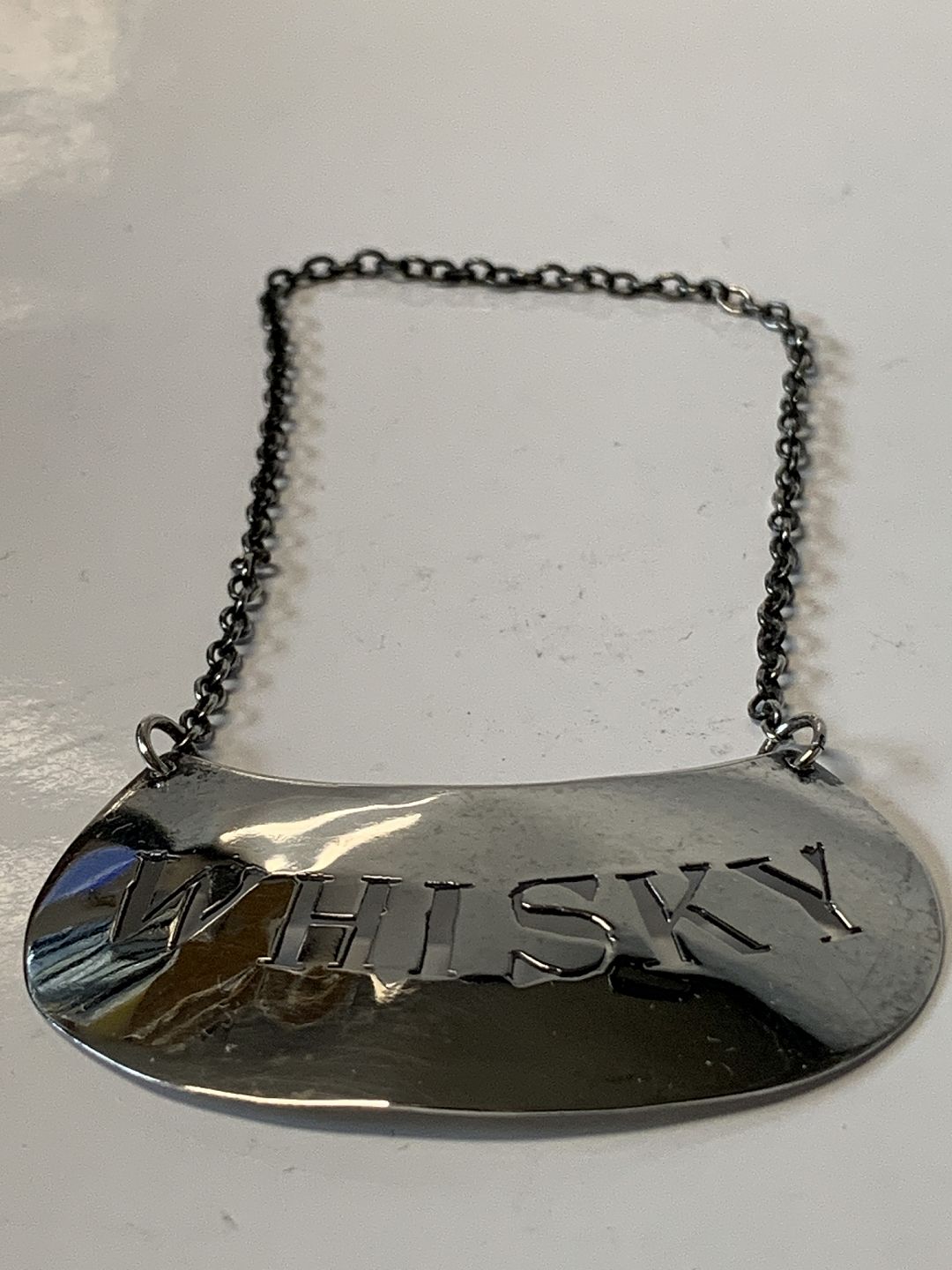 Whiskey sign, sterling, Bottle / Decanter sign. Width 5 cm. Stamped: E. Dragsted. Sterling. Nice condition.