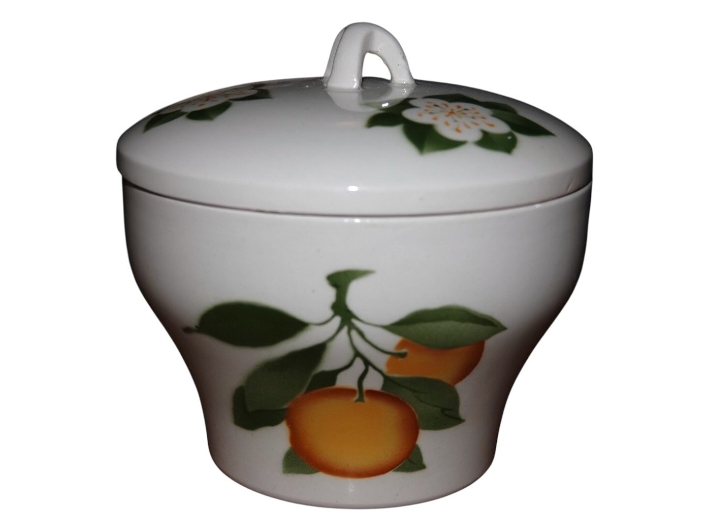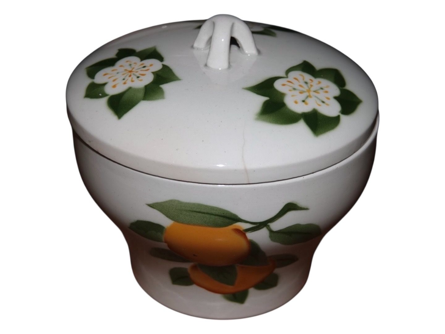 There is a hairline crack at the lid and a chip on the inside of the lid, please see pictures, otherwise excellent condition.