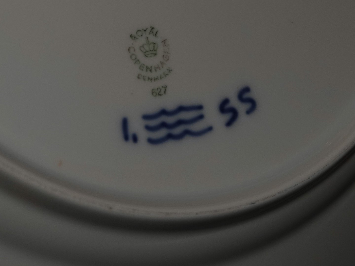Royal Copenhagen Musselmalet Riflet, ekstra stor middagstallerknen. Disse er malet i Danmark. Dekorationsnummer 627. 2. sortering. Diameter 27,5 cm. Perfekt stand.