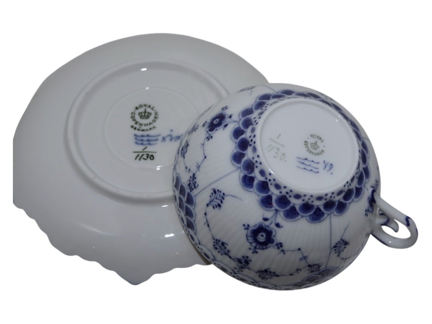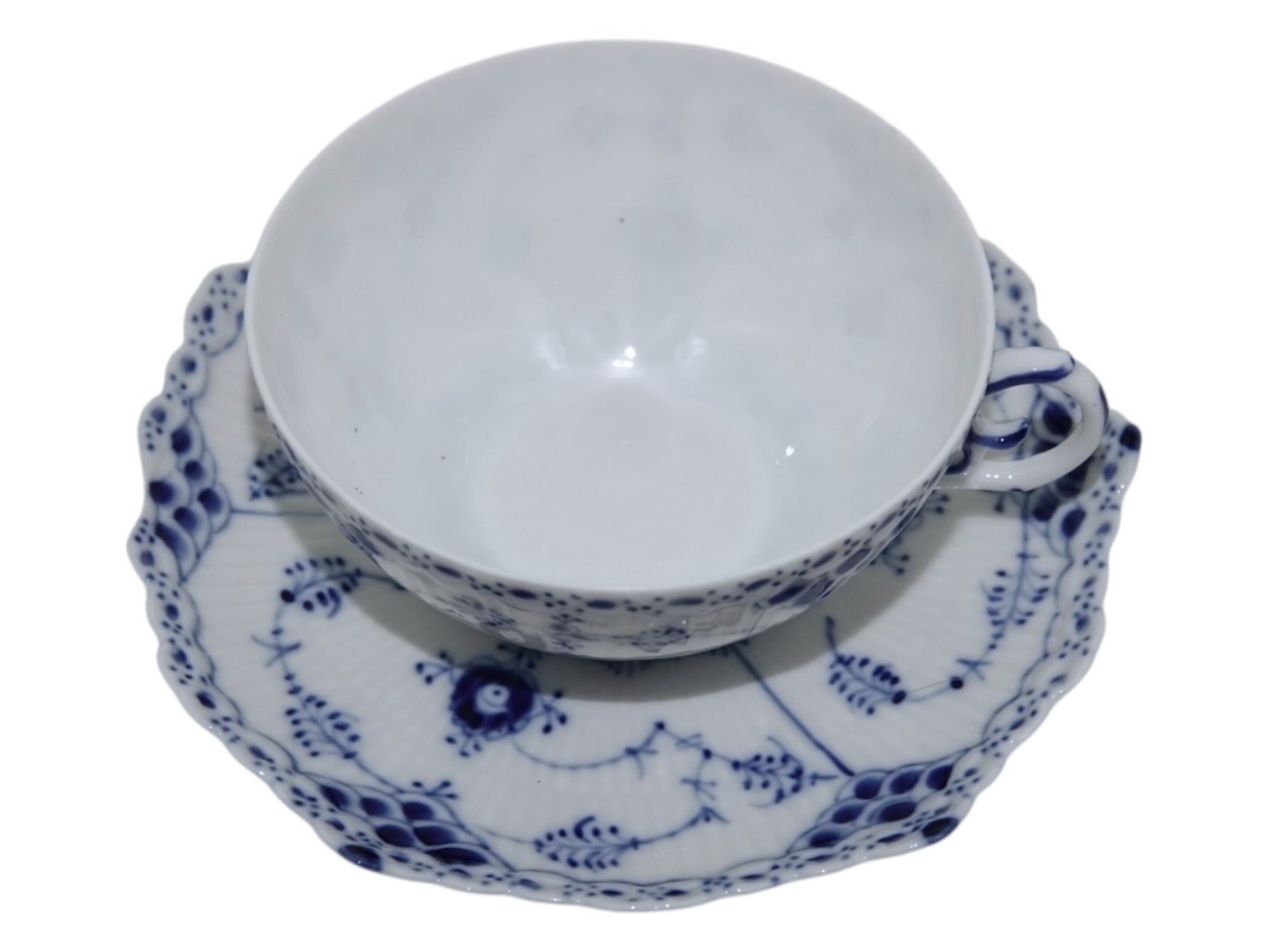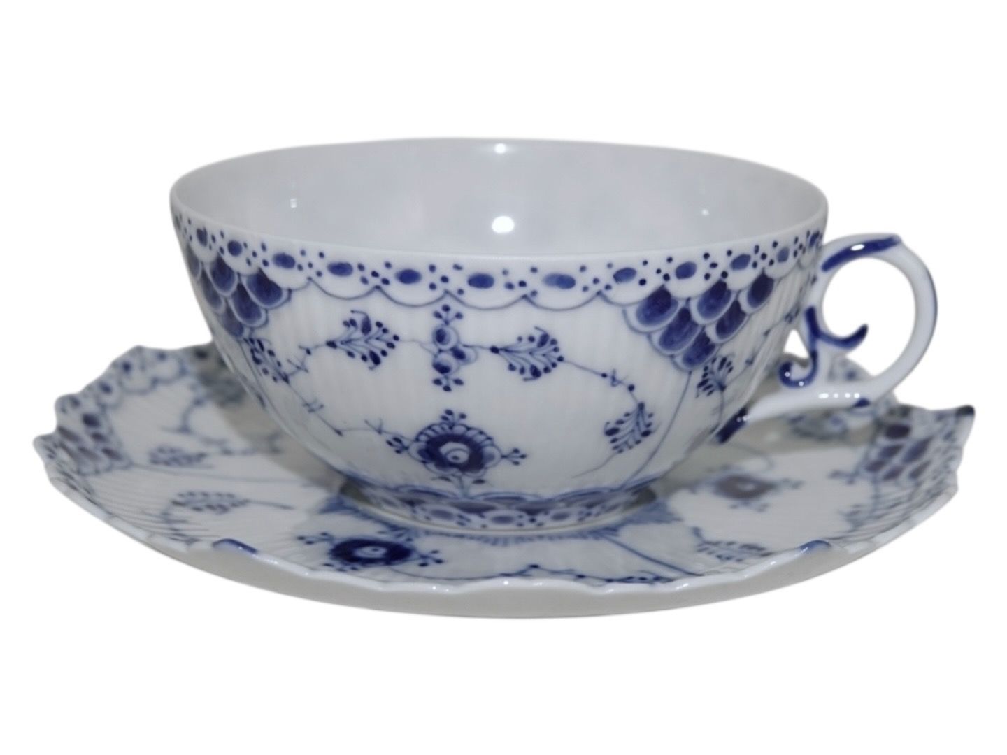 Royal Copenhagen Blue Fluted Full Lace, tea cup with matching saucer.