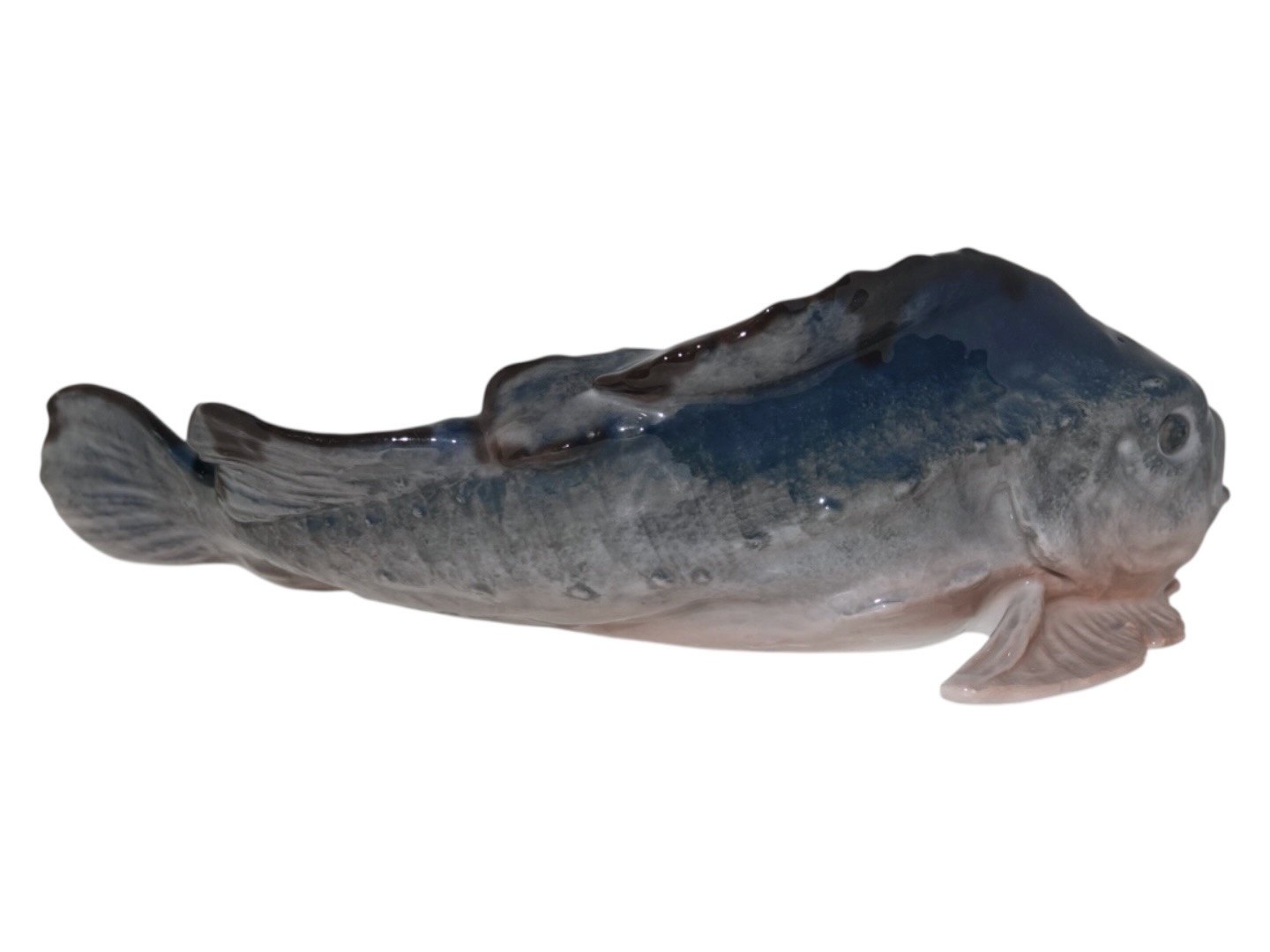 Stor og sjælden Royal Copenhagen fiskefigur, stenbider. 2. sortering pga. et par små glasurbobler. Længde 29,0 cm., bredde 14,0 cm. Perfekt stand uden fejl.