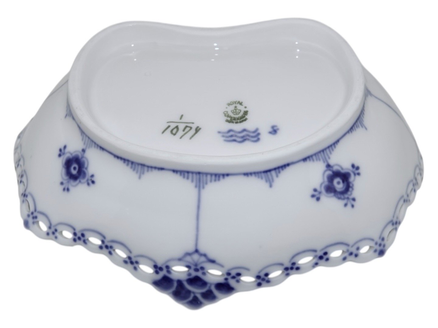 Royal Copenhagen Musselmalet Helblonde, skål. Fabriksmærket viser, at denne er produceret i mellem 1923 og 1928. Dekorationsnummer 1/1074. 3. sortering. Måler 18,5 x 16,8 cm. Perfekt stand uden fejl.