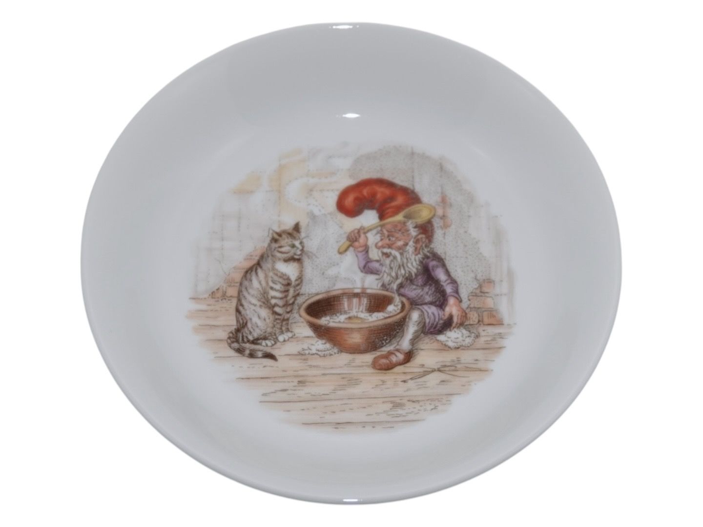 Royal Copenhagen Christmas, dish with gnome and cat Factory first. Diameter 13.7 cm. Perfect condition with no chips, cracks or repairs.