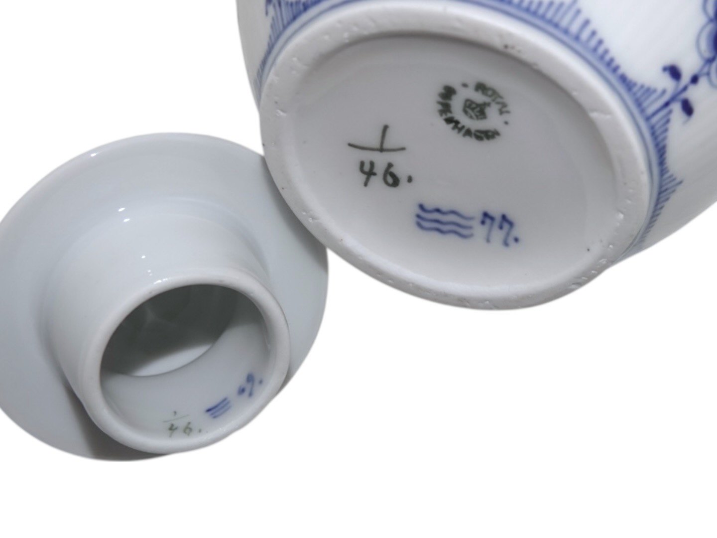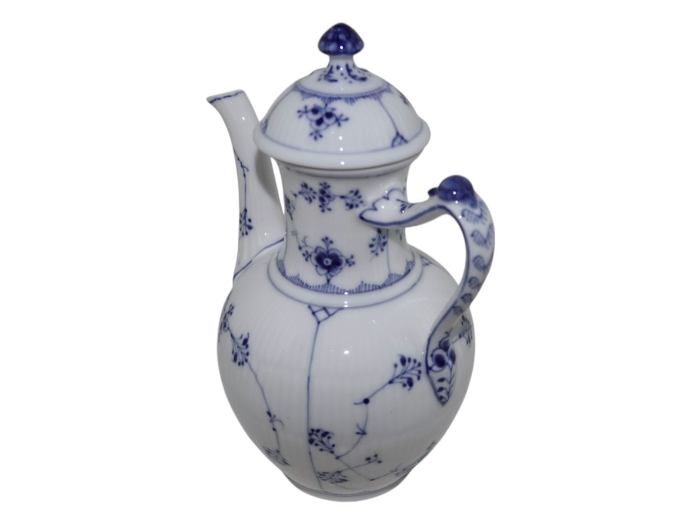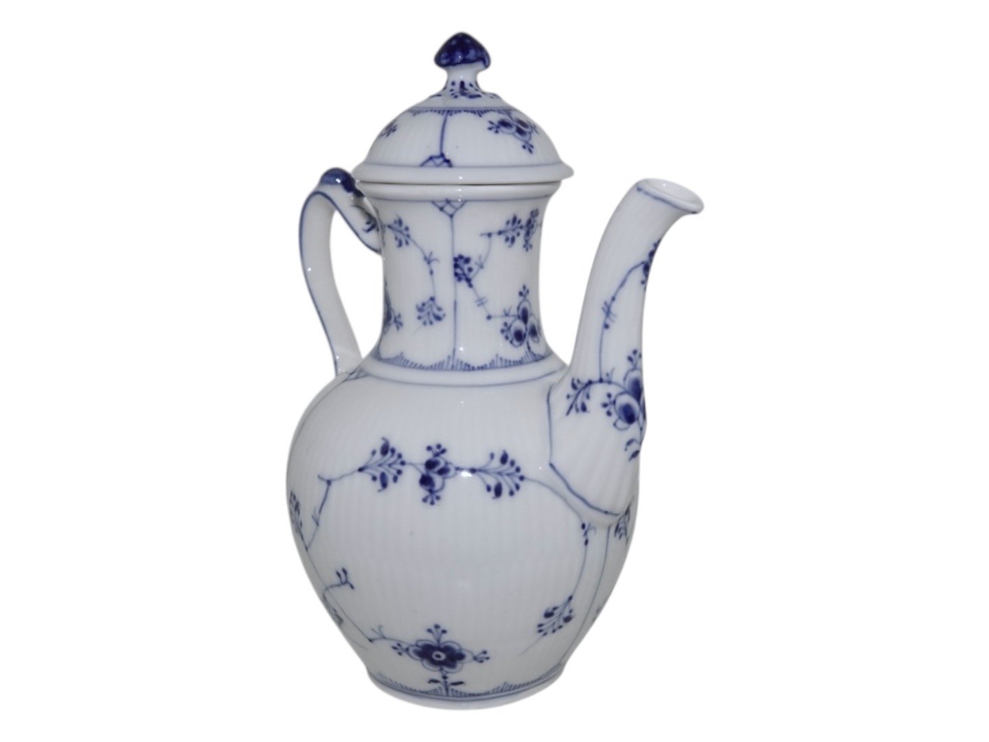 Royal Copenhagen Musselmalet Riflet, lille kaffekande. Dekorationsnummer 1/46. Stemplerne viser, at denne er produceret i mellem 1898 og 1923. 1. sortering. Højde 19,5 cm. inklusive låg. Perfekt stand uden fejl.