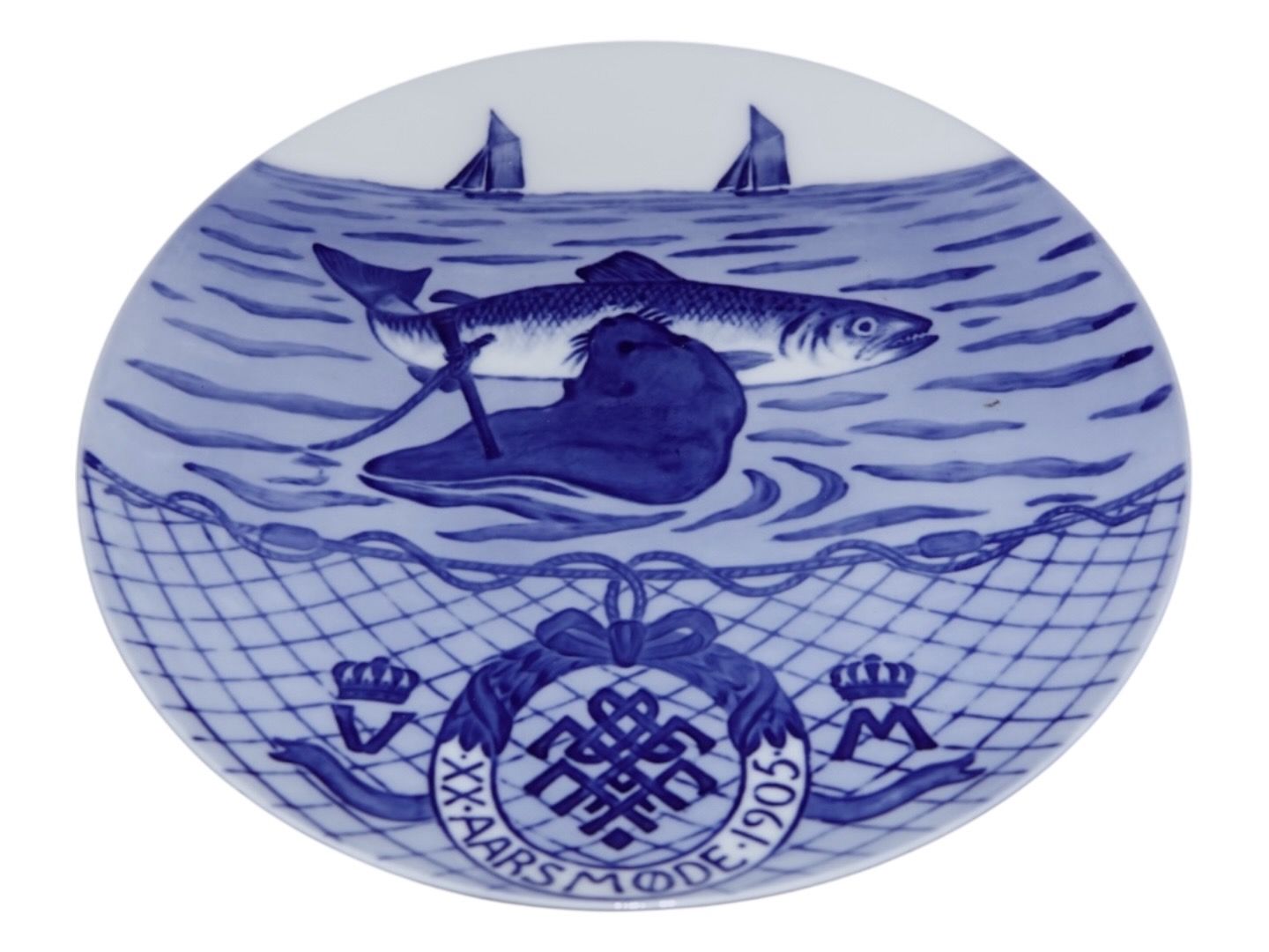 Royal Copenhagen Commemorative plate from 1905. Fishery Association decorated with a seal with a salmon in the mouth. Factory first. Diameter 20.0 cm. Perfect condition.