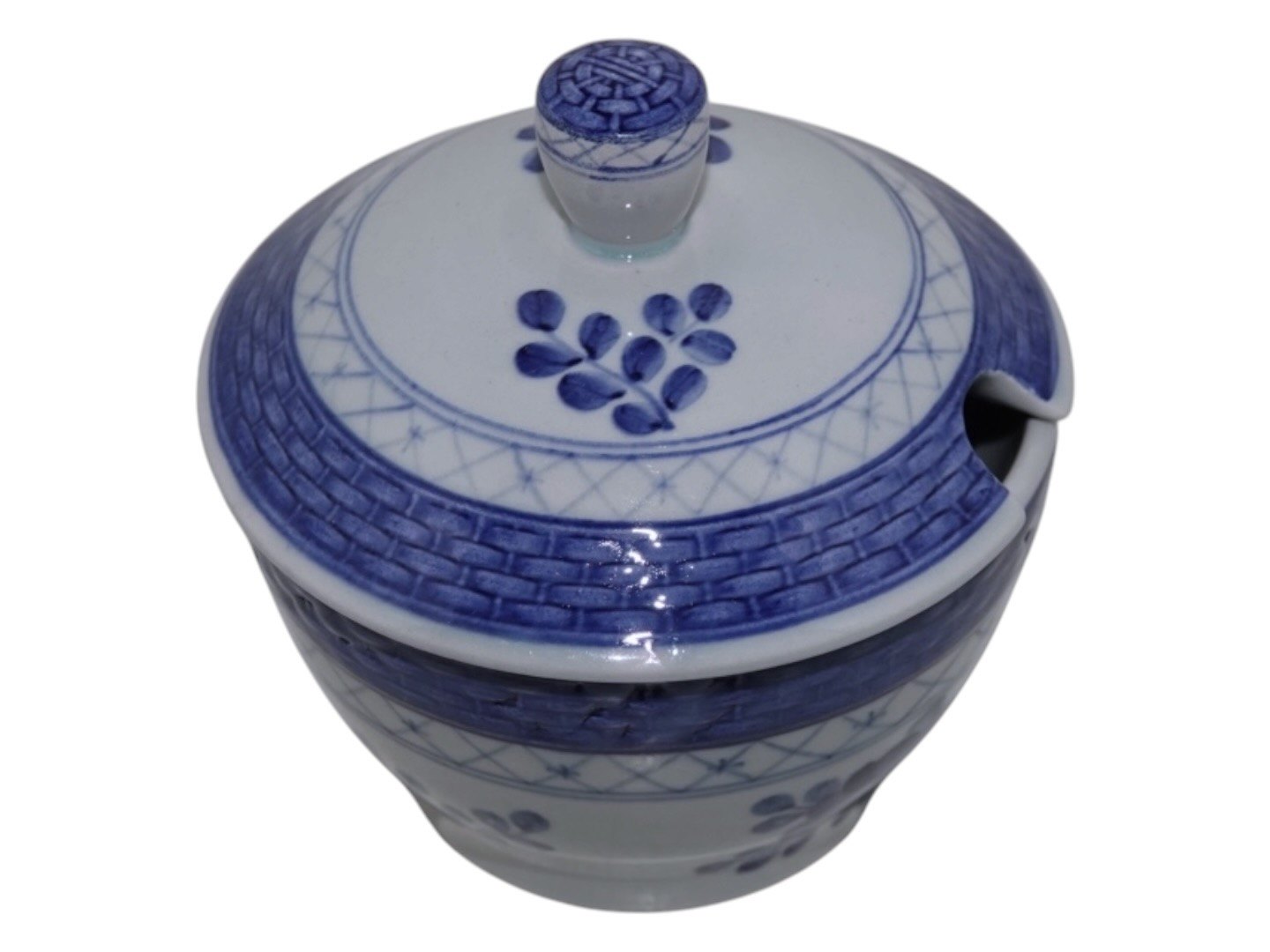 Aluminia Tranquebar, sjælden set marmeladekrukke. Dekorationsnummer 11/953. 1. sortering. Diameter 10,0 cm. Der er svage krakkeleringer i glasuren ellers perfekt stand uden fejl.