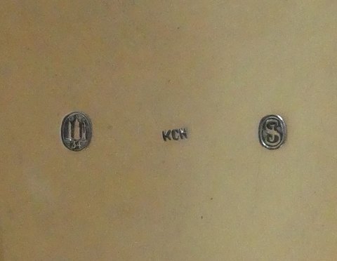 Kasserolle eller stor skål i tretårnet sølv med sort træhank fra 1934, pæn og velholdt. Fremstillet af sølvsmed K.C. Hermann, København. Københavner stempel med årstal 34, KCH for K.C. Hermann og guardein "JS" for Jens Sigsgaard (1932-1960).