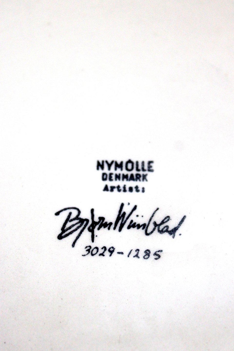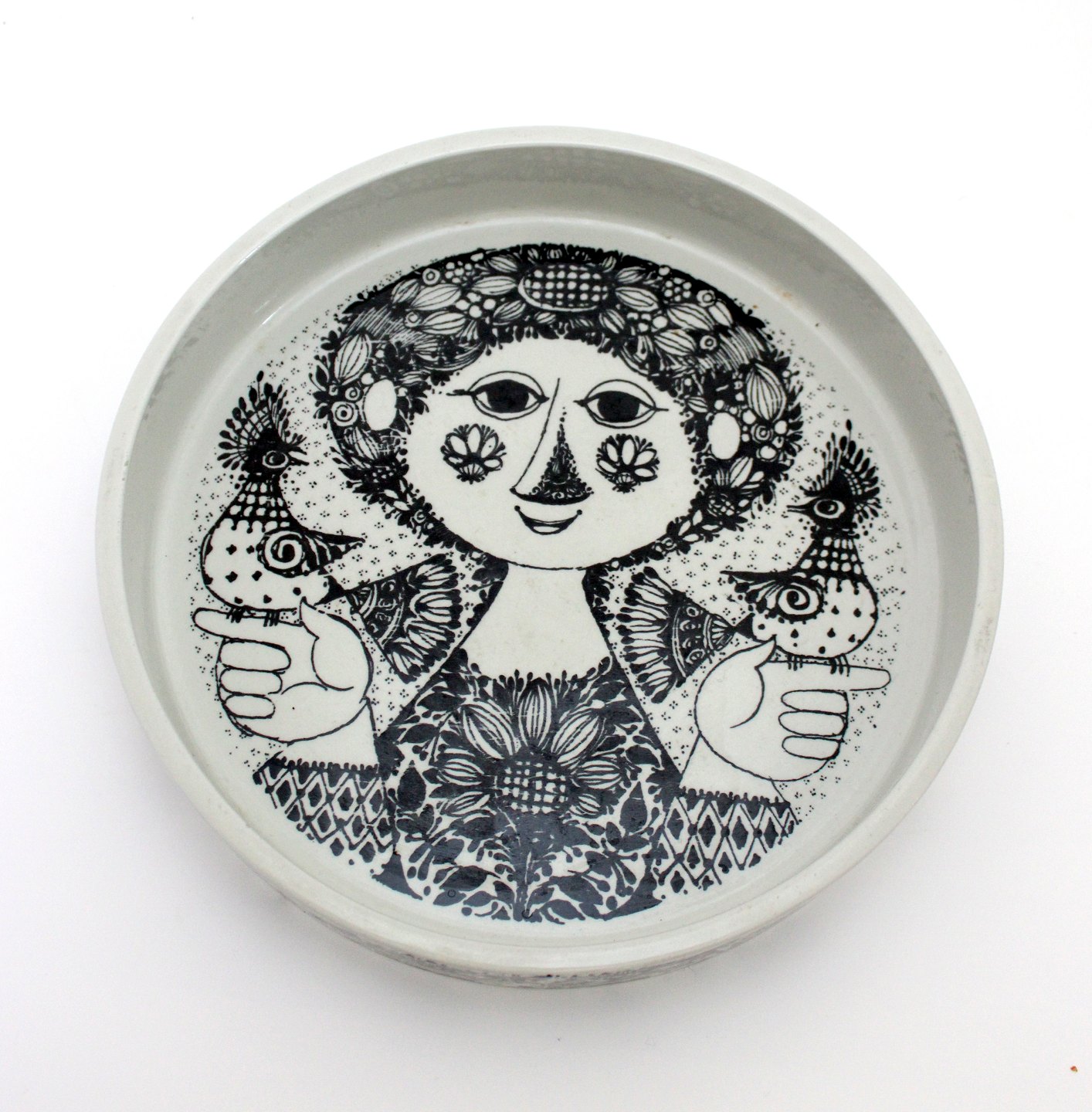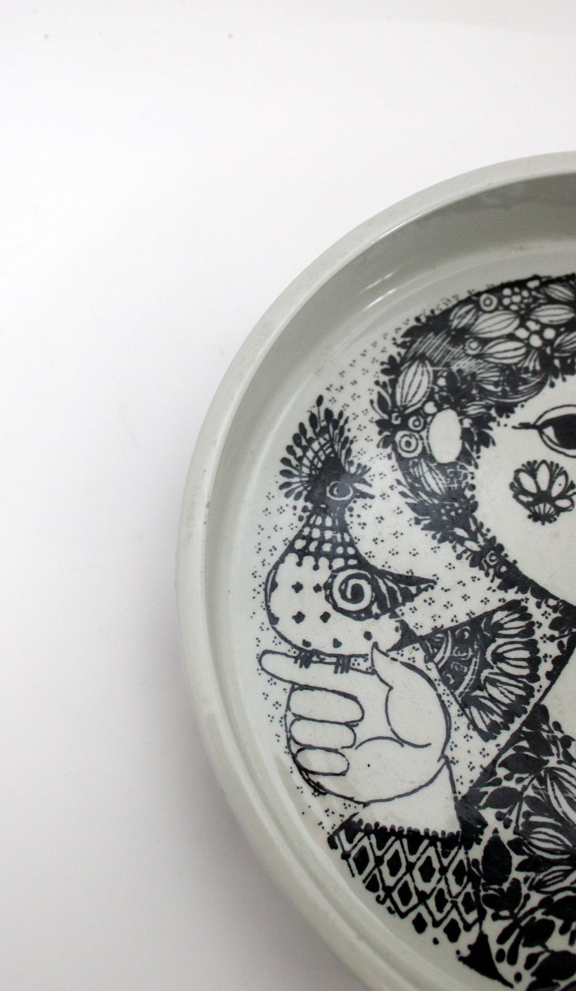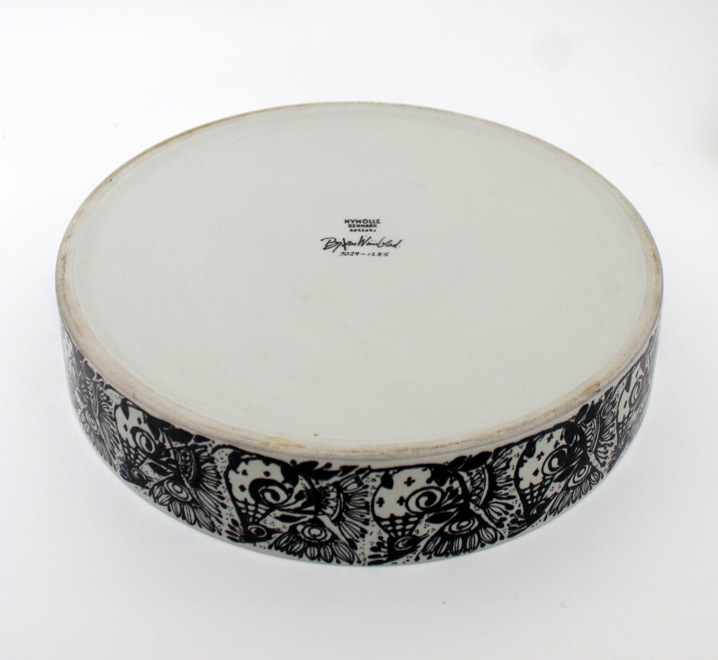 Frugtskål, Bjørn Wiinblad, Nymølle. Diameter 22 cm. Højde 4,5 cm. Der er lidt ujævnhed i glasuren på kanten ellers fin stand. Pris: 300 kr. stk. Lager: 1 Udstiller