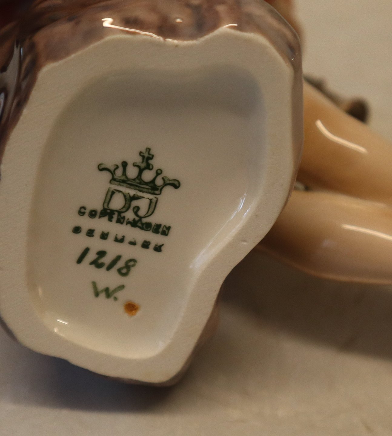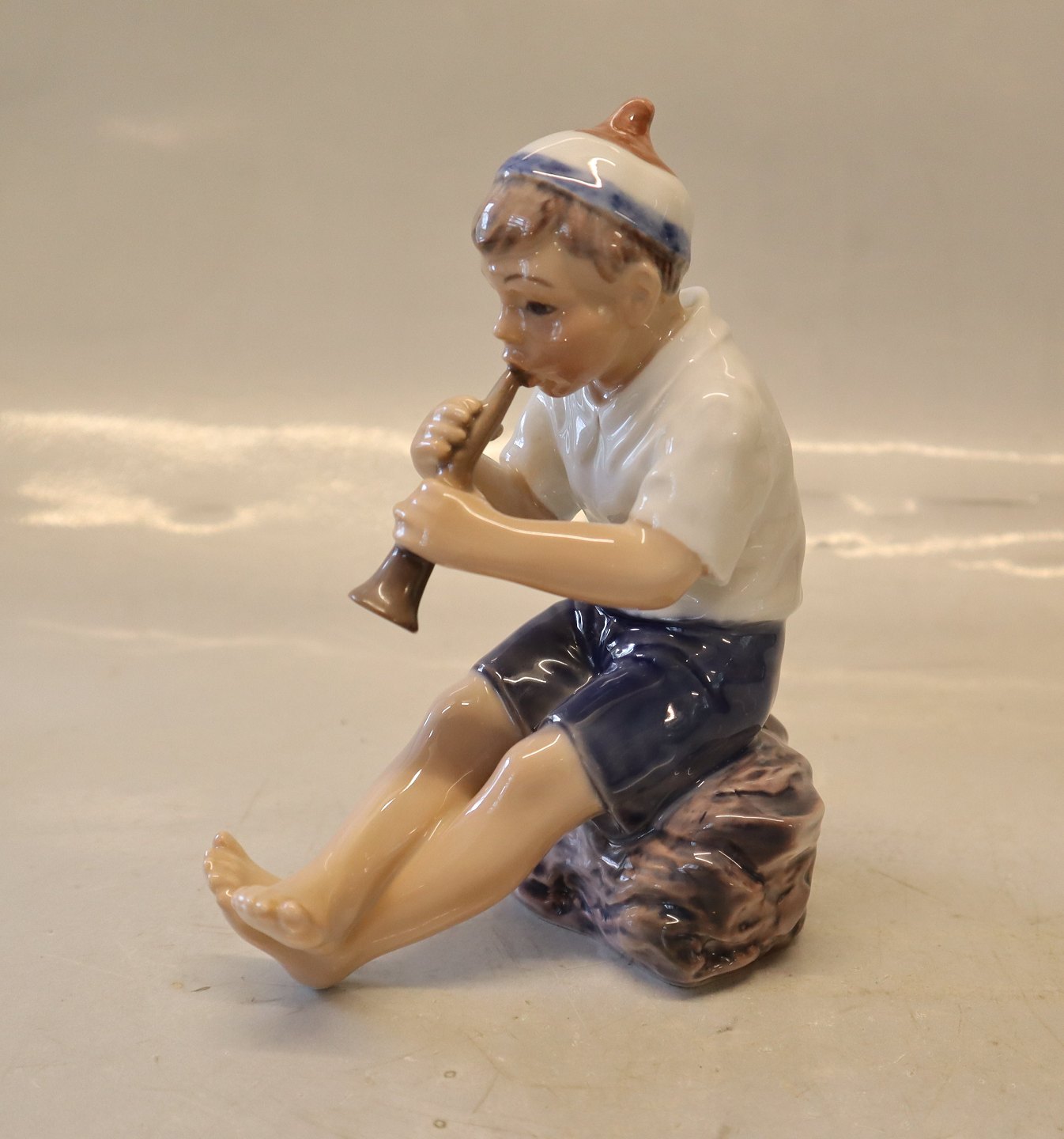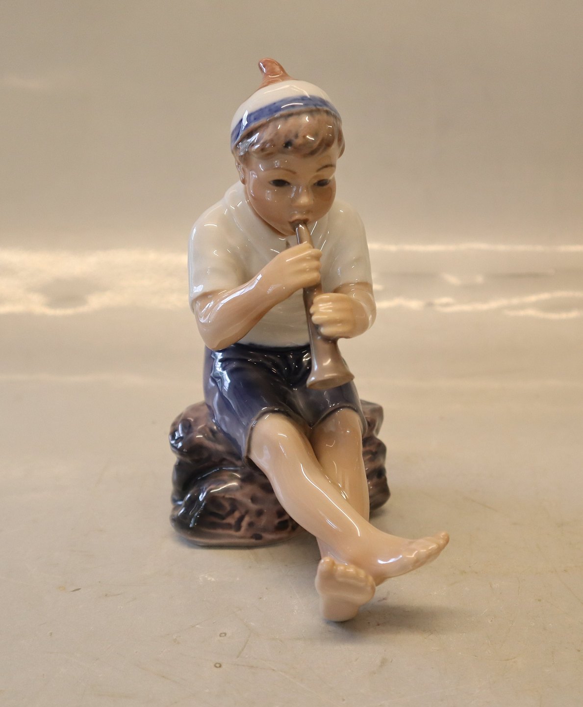 1 x 2. sortDahl Jensen 1218 Dreng med trompet 14 cm (DJ). Den lille hornblæser. Mærket med kongelig krone og DJ Copenhagen i hel og fin stand.