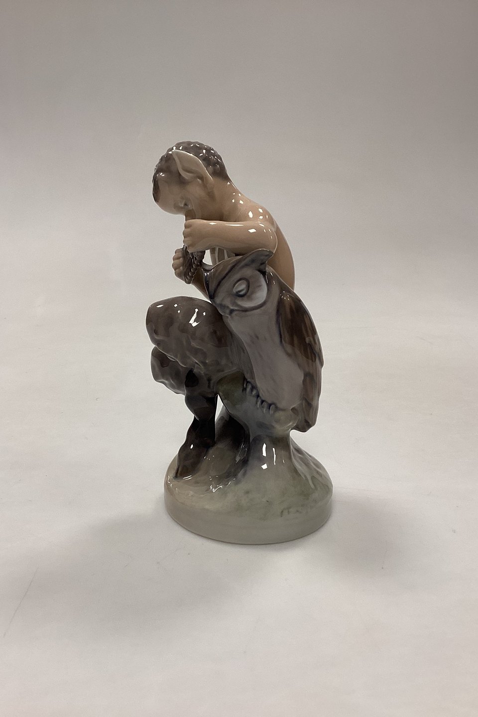 Royal Copenhagen Figur Faun med Ugle No. 2107. Designet af Chr. Thomsen i 1920.Måler 16 cm x 11 cm / 6,29 in. x 4,33 in. 1. Sortering.