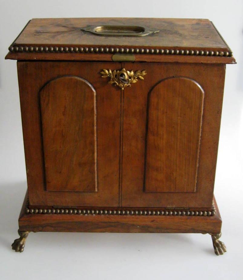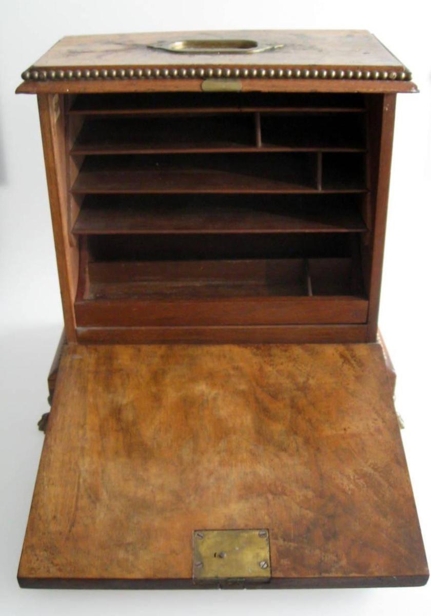 Engelsk skriveskrin, 19. årh. Valnød. Med messingmontering, løveben og hank. Med låge med dekorationer og lås. Indvendig med flere hylder og rum. H.: 29 cm. B.: 28 cm. D.: 18 cm.Emne nummer: 6156