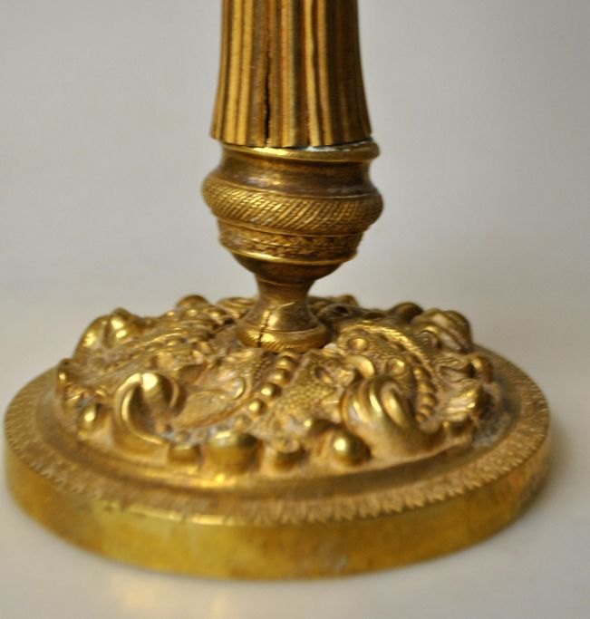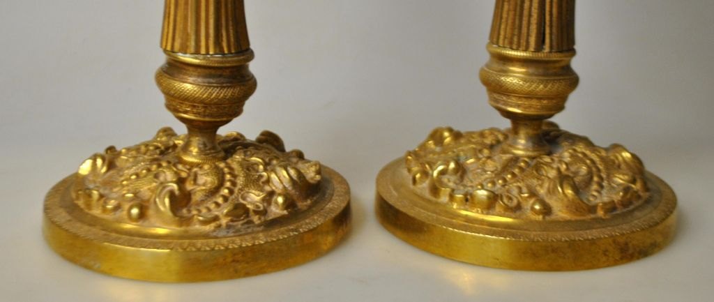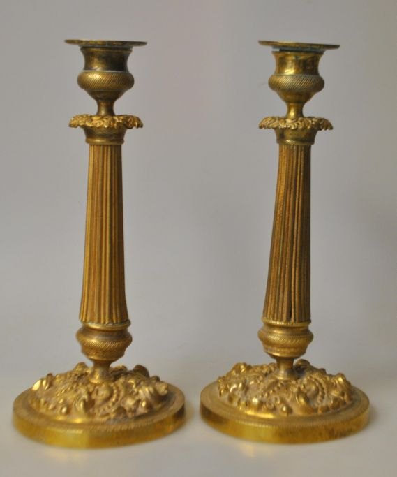 Par franske lysestager i messing/bronze, lueforgyldt, 19. årh. Fod med rococo dekorationer og stamme med kannelleringer. H: 24 cm. Emne nummer: 12287