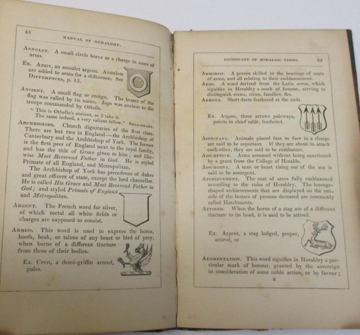 The Manual of Heraldry. London 1846. Printed for Jeremiah How. Med 400 træsnit. 17 x 10,5 cm. Emne nummer: 14549