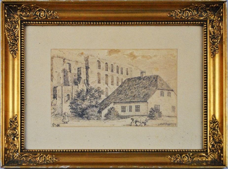 Jensen, Karl Georg (1851 - 1933) Danmark En lille pige ved Koldinghus. Tusch på papir. Signeret: Monogram KJ, 19. 12. 82. 18 x 12 cm. Indrammet med hjørneornamenteret samtidig ramme. Tegningen er antagelig dateret op til jul - og en gave, idet motivet er fra sommeren.Emne nummer: 15573