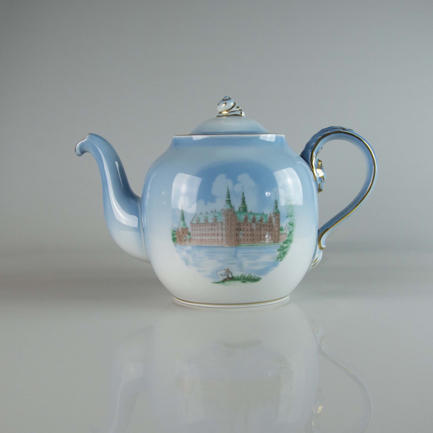 Tekande i porcelæn fra Danmarksstellet med guldkant og motiv af Kronborg. Nr. 656/3562Producent Bing og Grøndahl