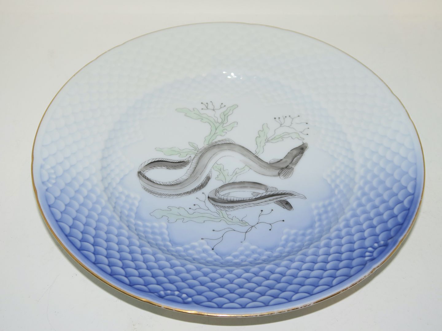 Bing & Grøndahl Måge med guldkant, fisketallerken med motiv nummer 8: Aal.Dekorationsnummer 26 eller nyere nummer 326.