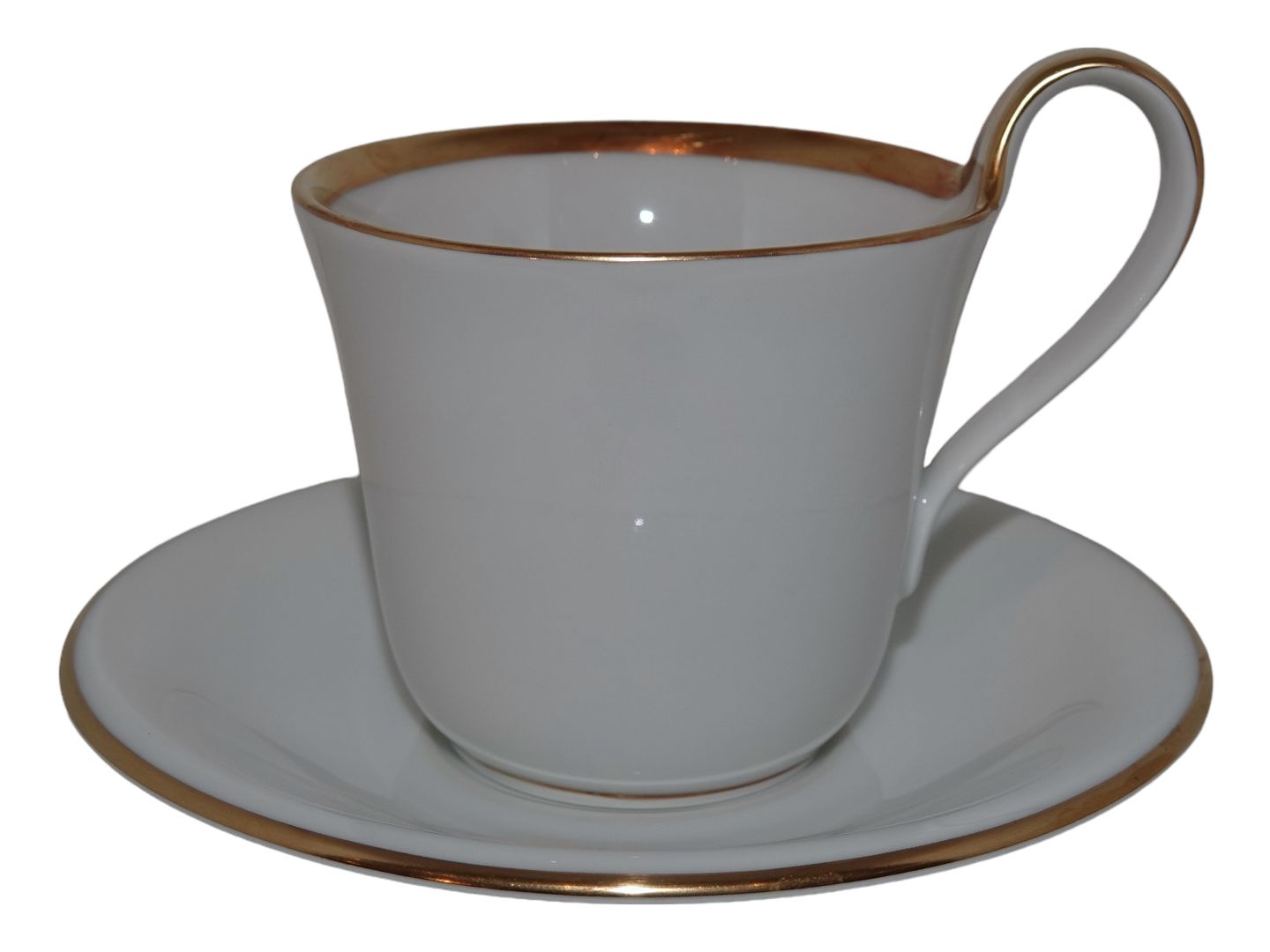 Bing & Grøndahl Jet'aime, hvid højhankskop med guldkant og underkop. De findes i tre størrelser. Disse er mellemstørrelse.Dekorationsnummer 485 eller ældre nummer 110 eller Royal Copenhagen nummer 090.