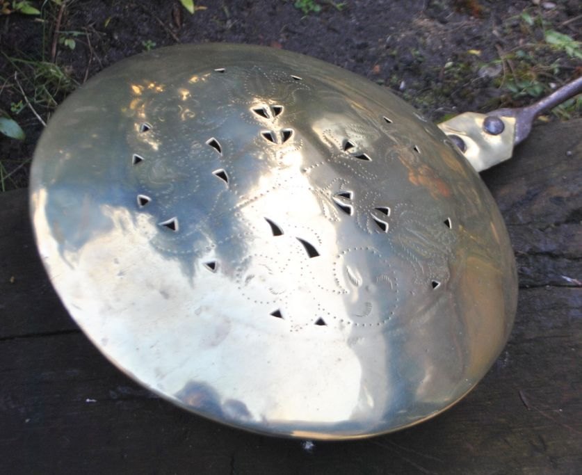 Dansk varmebækken i messing/jern med træhåndtag. 18. årh. L.: 115 cm. Dia.: 30 cm. Låg dekoreret med tulipaner. Stemplet. Antagelig arbejde fra Kobbermøllen i Flensborg. Emne nummer: 25229