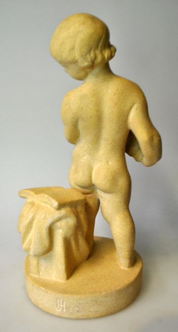 Dansk kunstner (20. årh.): En dreng med harmonika og noder. Kunst sten. Signeret: Monogram. Højde.: 29 cm. Antagelig Holger Jensen. Dansk Kunststen.Emne nummer: 25467
