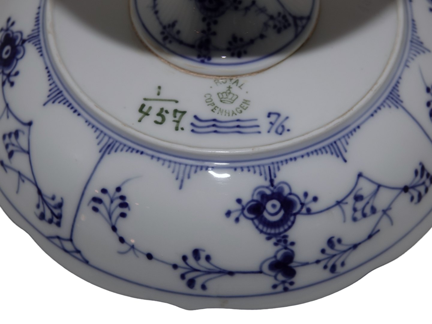 Royal Copenhagen Musselmalet Riflet, lille kageopsats på fod.Fabriksmærket viser, at denne er produceret mellem 1898 og 1923.