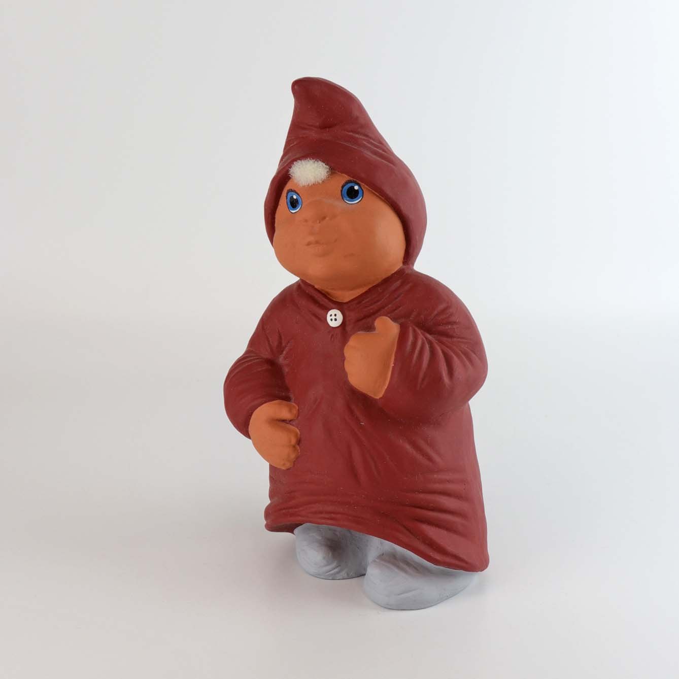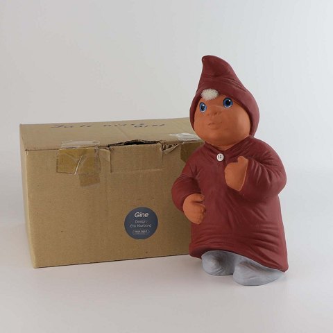 Klarborg figur af nissepigen Gine, som er iført rød nissehue og en lang rød natkjole. Design Etly Klarborg