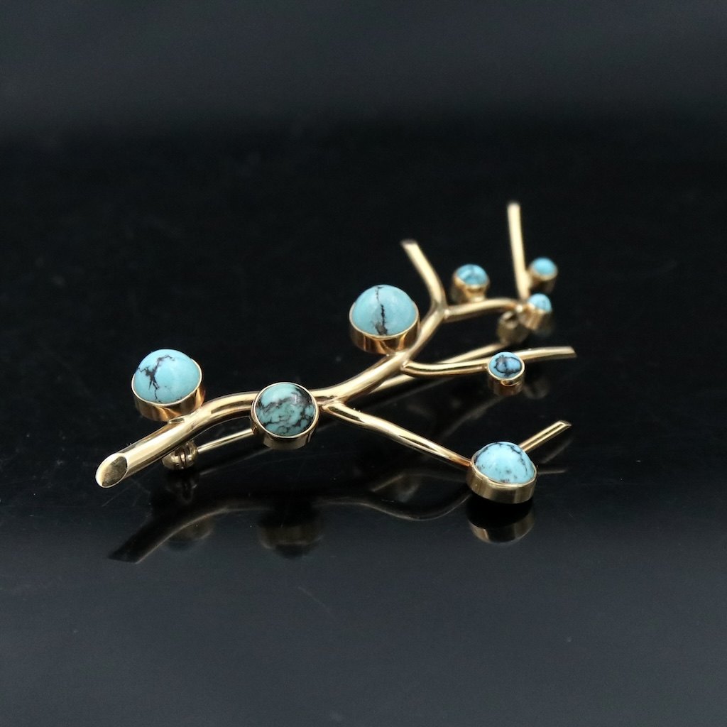 Karen Strand. Broche i 18k guld med turkis.Tegnet og udført hos Karen Strand 1924-2000.