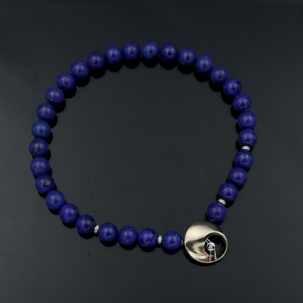 Lapis Lazuli perlekæde med diamantlås i 14k guld og sterlingsølv.