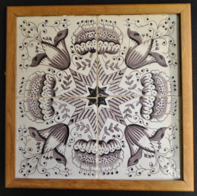 Firpas with Dutch tiles, middle part of the 18th century. Ornament tile. Manganese colored. 12.8 x 12.8 cm.Framed.