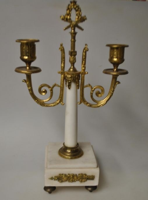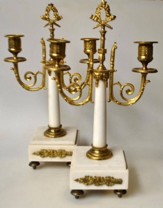 Et par franske hvide marmorstager med lueforgyldt bronze, 19. årh. Fod og stamme i hvidt marmor. Hver stage med to lysarme i lueforgyldt bronze. Med dekorationer på fod, arme og midterstykke. H.: 35 cm.Perfekt stand!