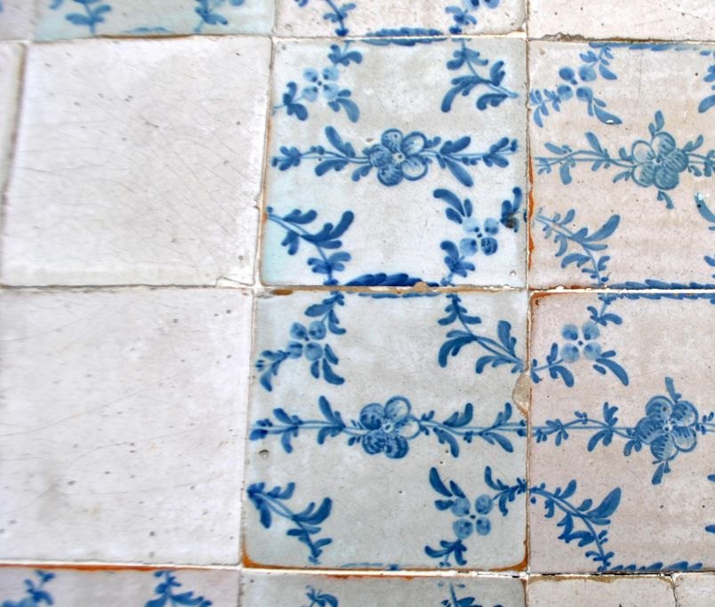 Sjældent originalt brun bemalet flisebord, Louis XVI, 1780, Danmark. Med tilspidsede ben. Med 16 fantastisk sjældne blåmalede ornament fliser med blomster og ranker fra Morsø Fabrikken i mønster. Herudover 8 helt hvide fliser fra samme periode - antagelig fra - København. Det hvide fliser sidder som et firpas i midten og en i hvert hjørne. H.: 70 cm. L.: 89 cm. D.: 62 cm. Proveniens: En gammel stor bindingsværksgård i Hårmark på Samsø. Bordet fremstår originalt - dog med restaureringer, bl.a. med beslag på kanten. Oprindelig har der været en skuffe i den ene ende og udtrækkelige bakker i hver sin ende. De 4 hvide fliser i hjørnene er med defekter.Emne nummer: 27384