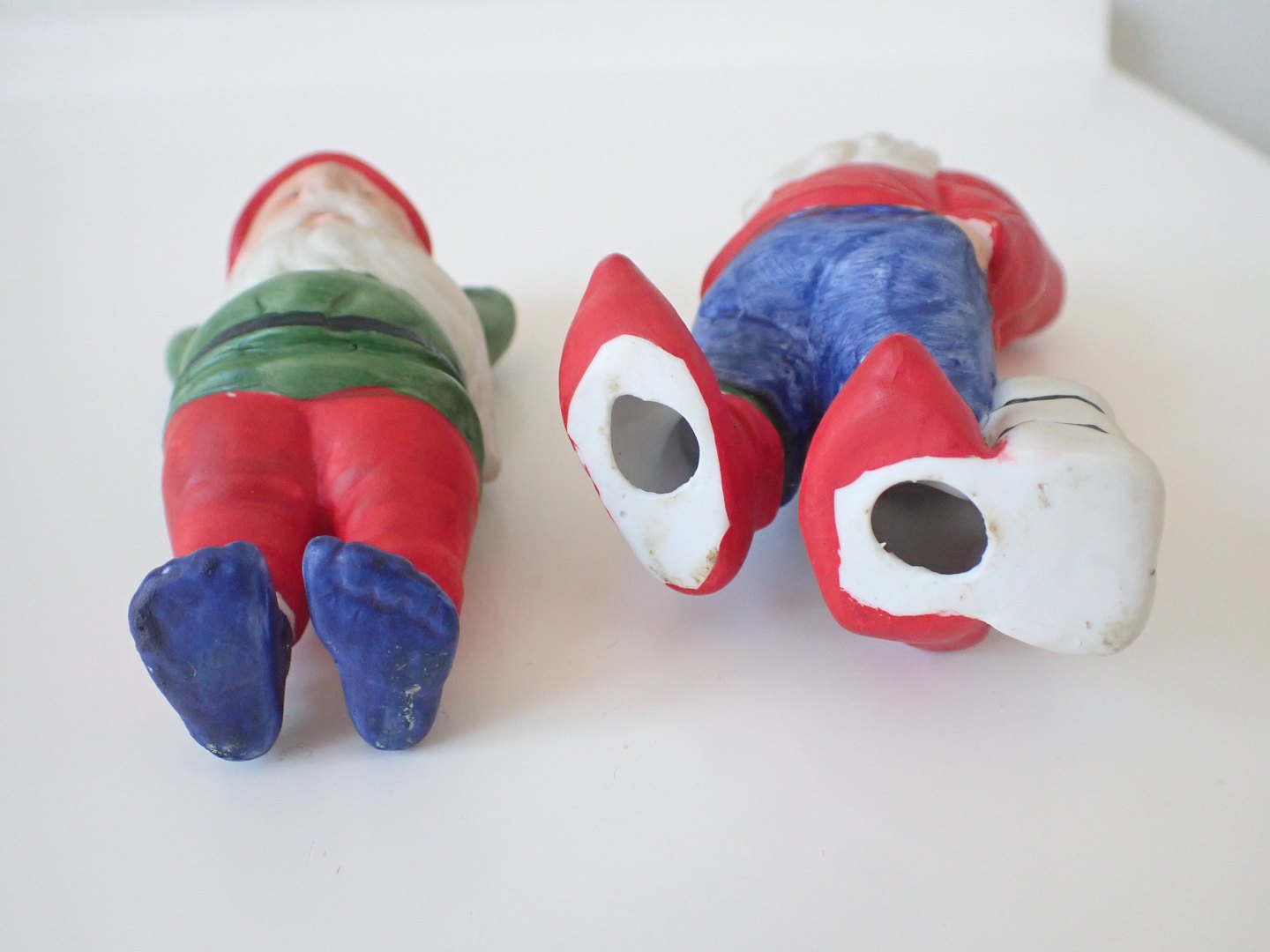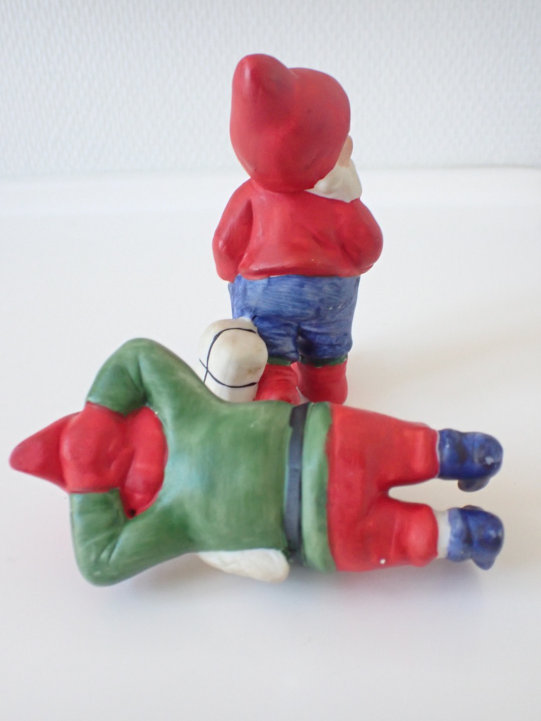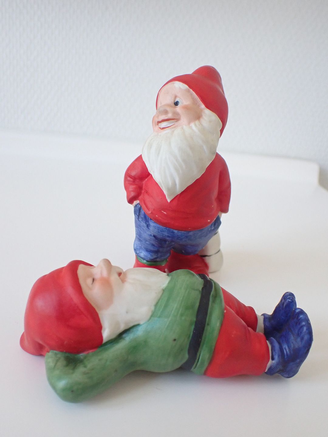 2 store håndmalede biscuitnisser, formentlig tyske. En ligger og sover og en står med en pakke. Fra 1970-erne. Højde: 10 cm. I fin stand. Sælges individuelt for 275 kr. pr. stk. Udstiller
