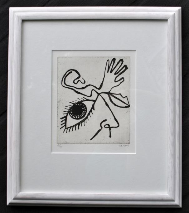 Ravn, Lars (1959 - ) Danmark: De fem sanser, 1989. Radering. Signeret: LR 1989. 6/10. H: 19,5 cm. B: 16,5 cm.Indrammet: H: 46 cm. B: 40 cm.