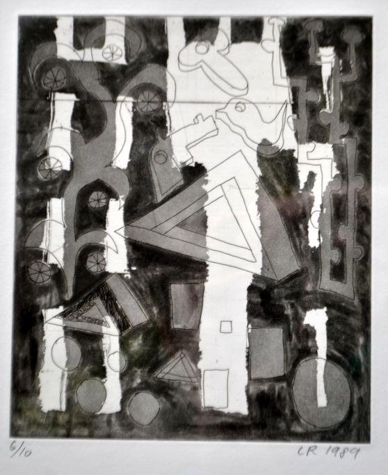 Ravn, Lars (1959 - ) Danmark: Komposition, 1989. Radering. Signeret: LR 1989. 6/10. H: 20 cm. B: 16,5 cm.Indrammet: H: 46 cm. B: 40 cm.