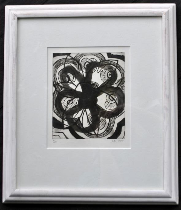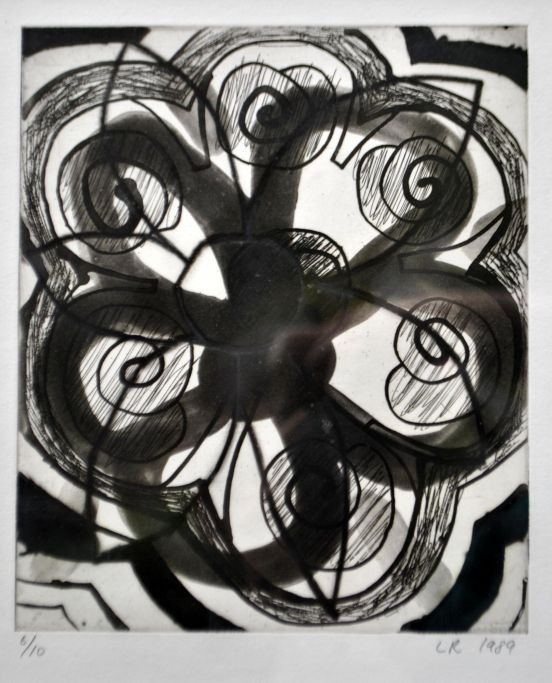 Ravn, Lars (1959 - ) Danmark: Komposition, 1989. Radering. Signeret: LR 1989. 6/10. H: 19,5 cm. B: 17 cm.Indrammet: H: 46 cm. B: 40 cm.