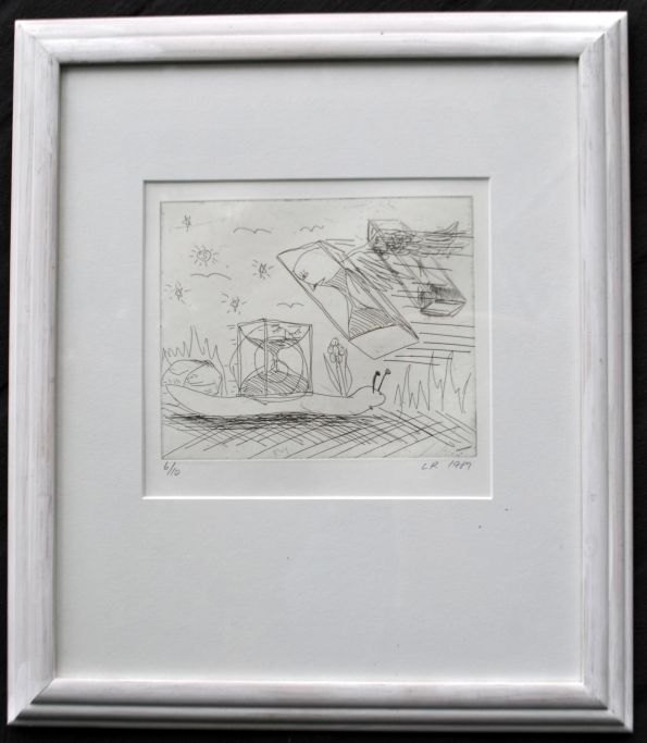 Ravn, Lars (1959 - ) Danmark: Komposition, 1989. Radering. Signeret: LR 1989. 6/10. H: 16,5 cm. B: 20 cm.Indrammet: H: 46 cm. B: 40 cm.