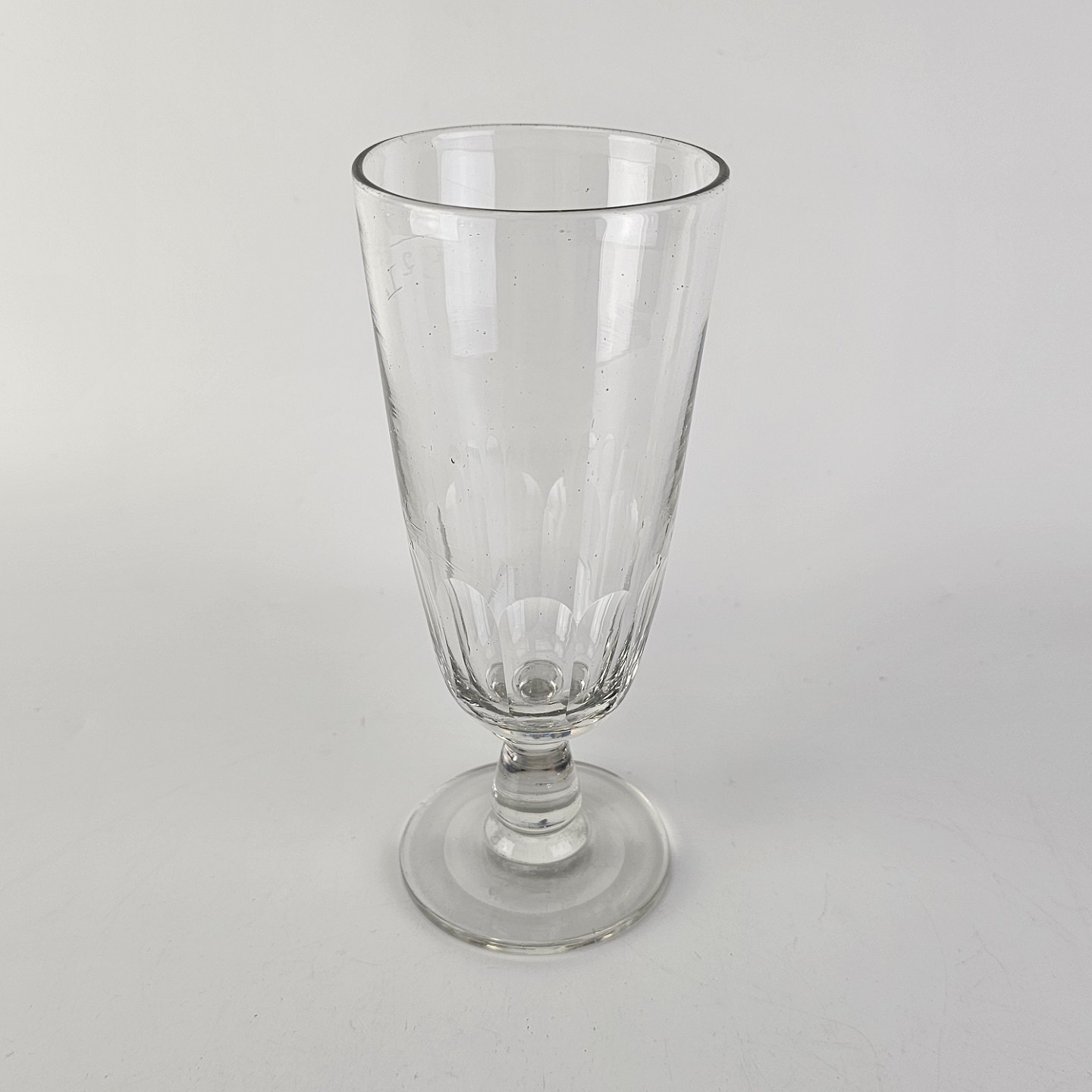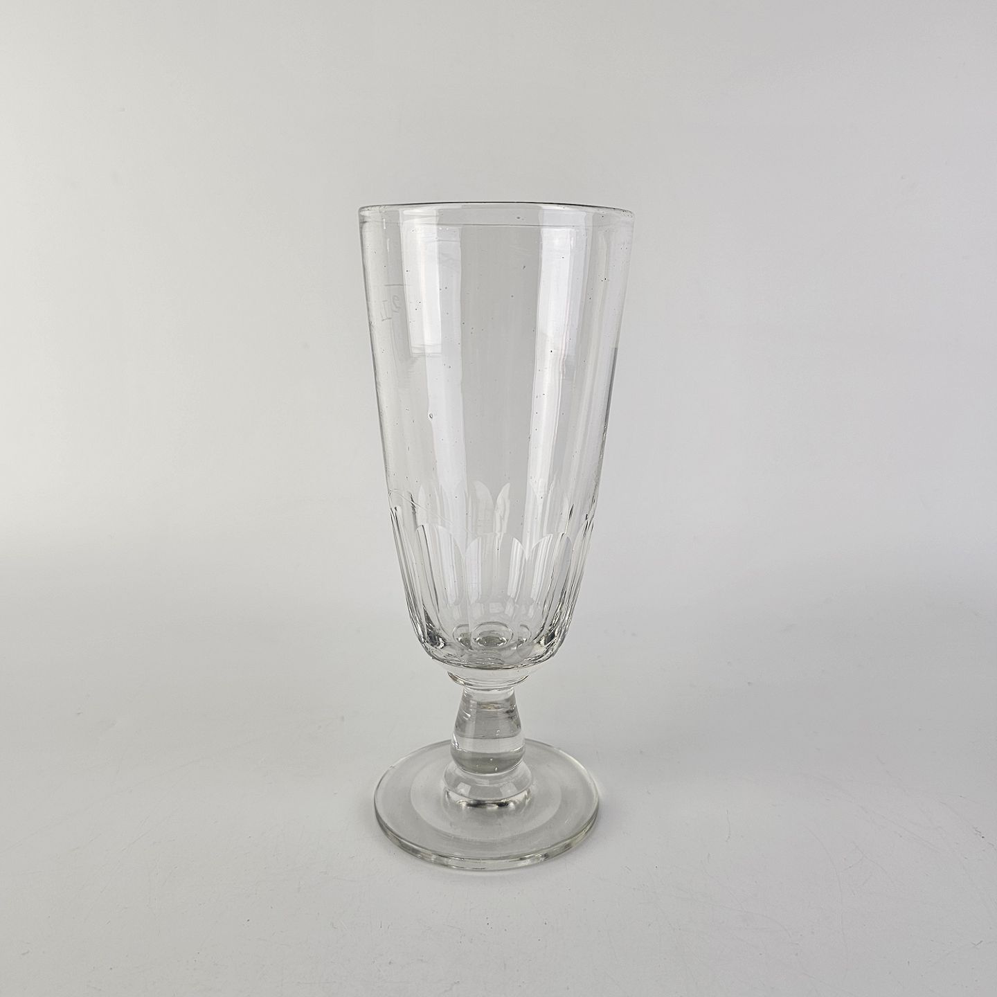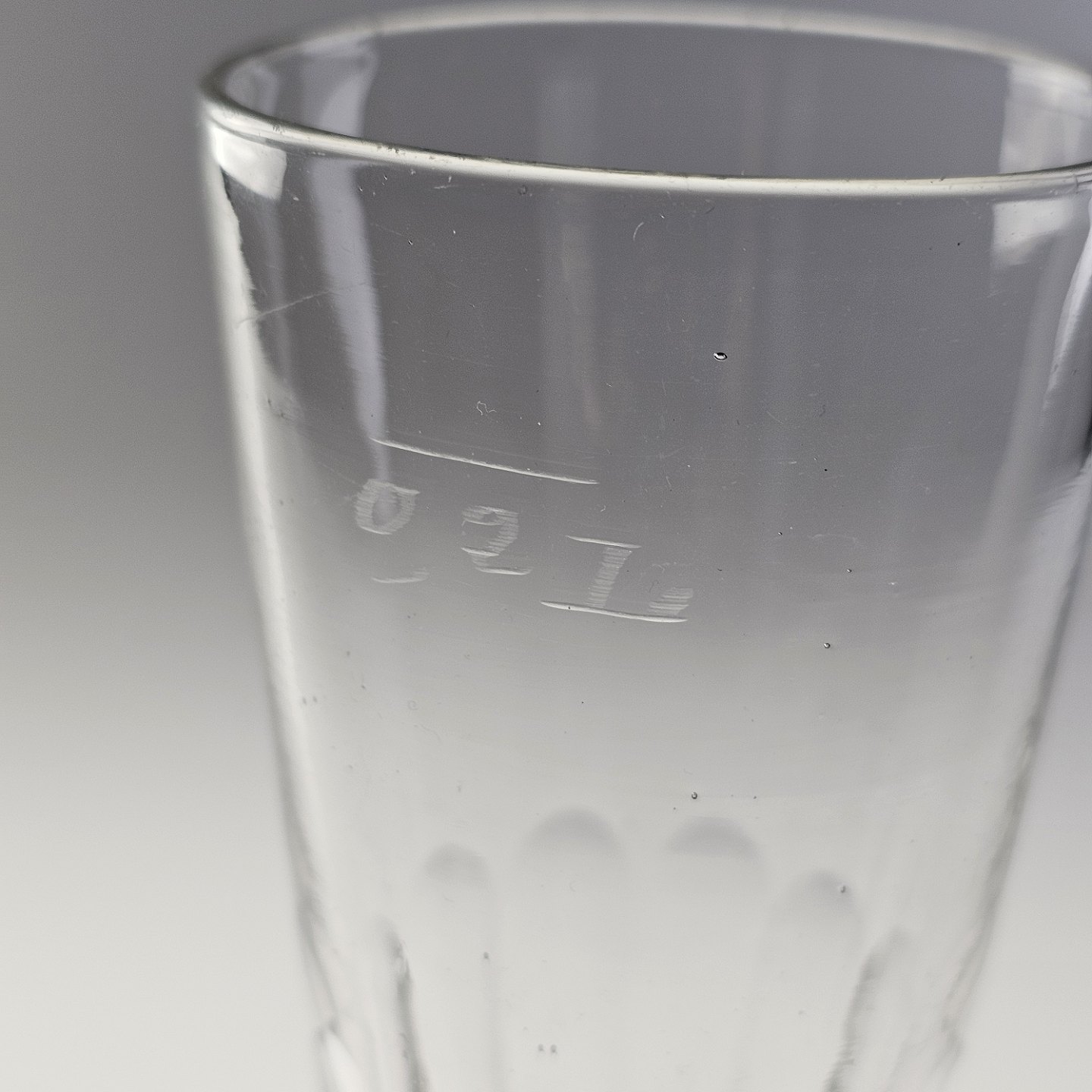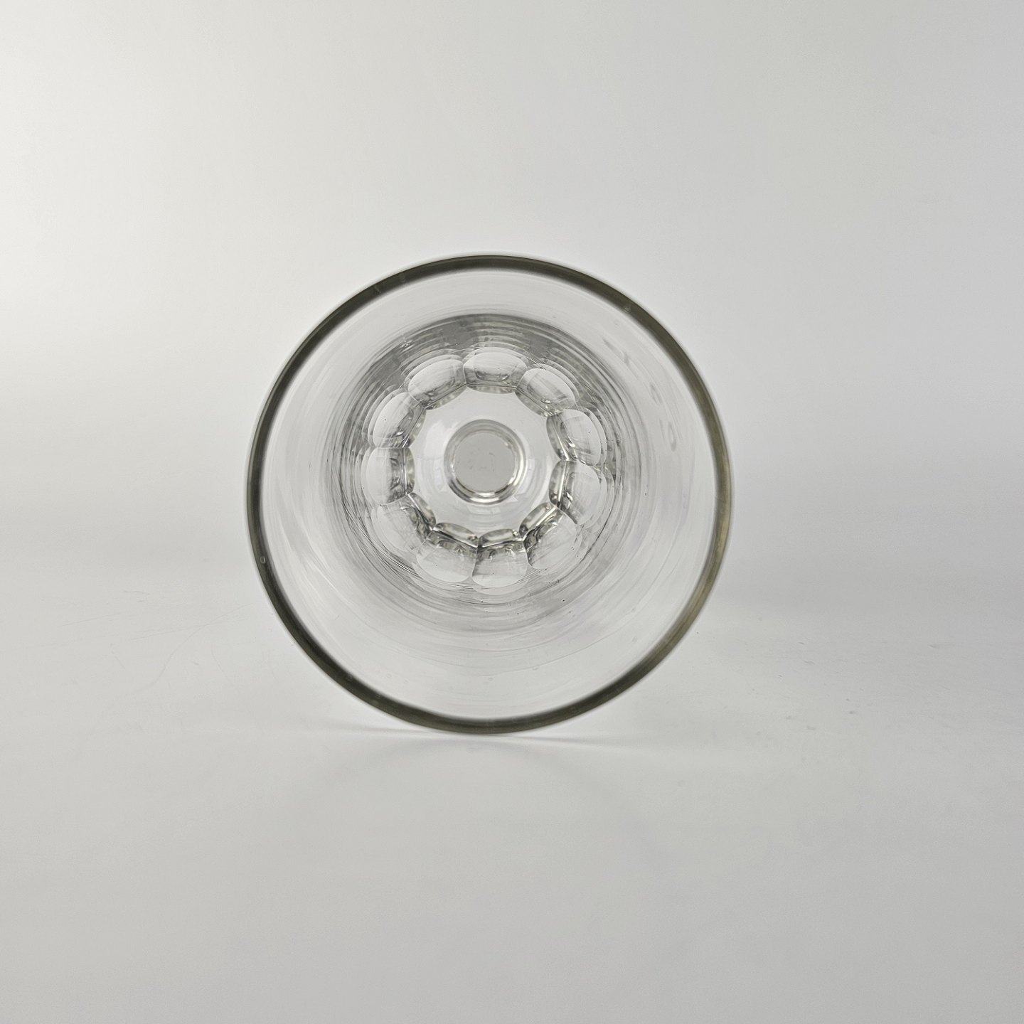 Vinglas i klart glas, opdrevet og kugleslebet i bund. Med olivenslibningerDer er graveret 0,2L ind i glasset