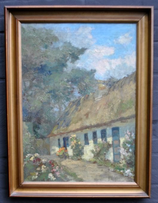 Pedersen, Hugo V. (1870 - 1959) Danmark: Blomster foran et hus. Olie på lærred. Signeret. 69 x 50 cm.Indrmmet: 83 x 61 cm.