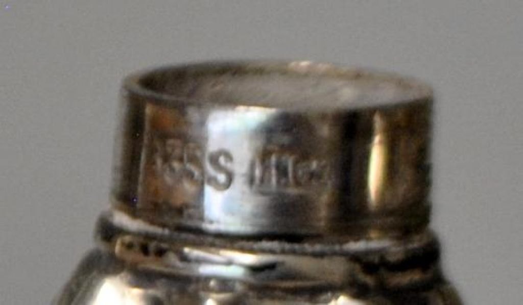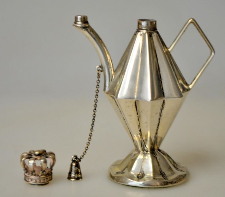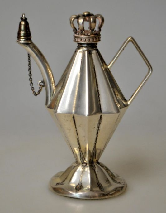 Hugo Grün lille olie lampe i sølv, 20. årh. København, Danmark. Stemplet: 835S H.Gr. Med låg i from af kongekrone. Med hank og tud. På udfyldt fod. H. 9 cm.Emne nummer: 27935