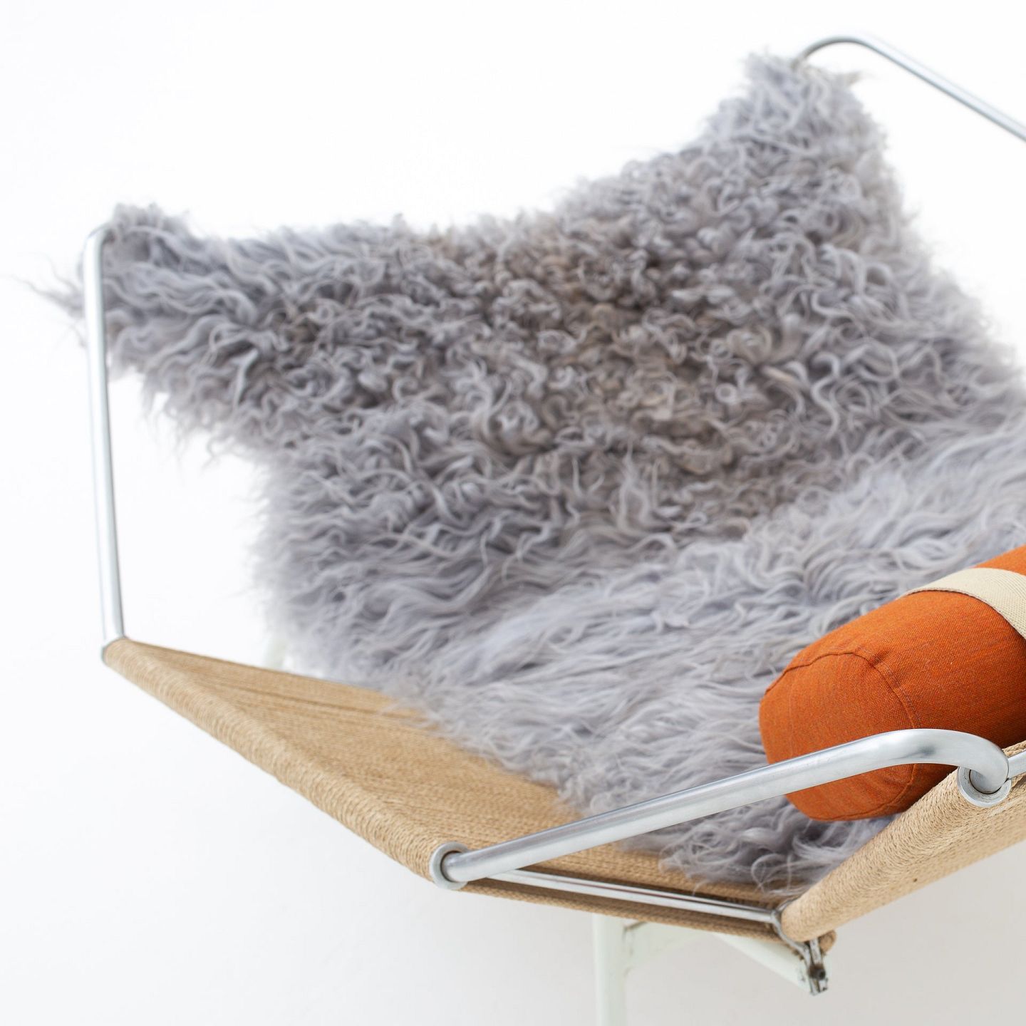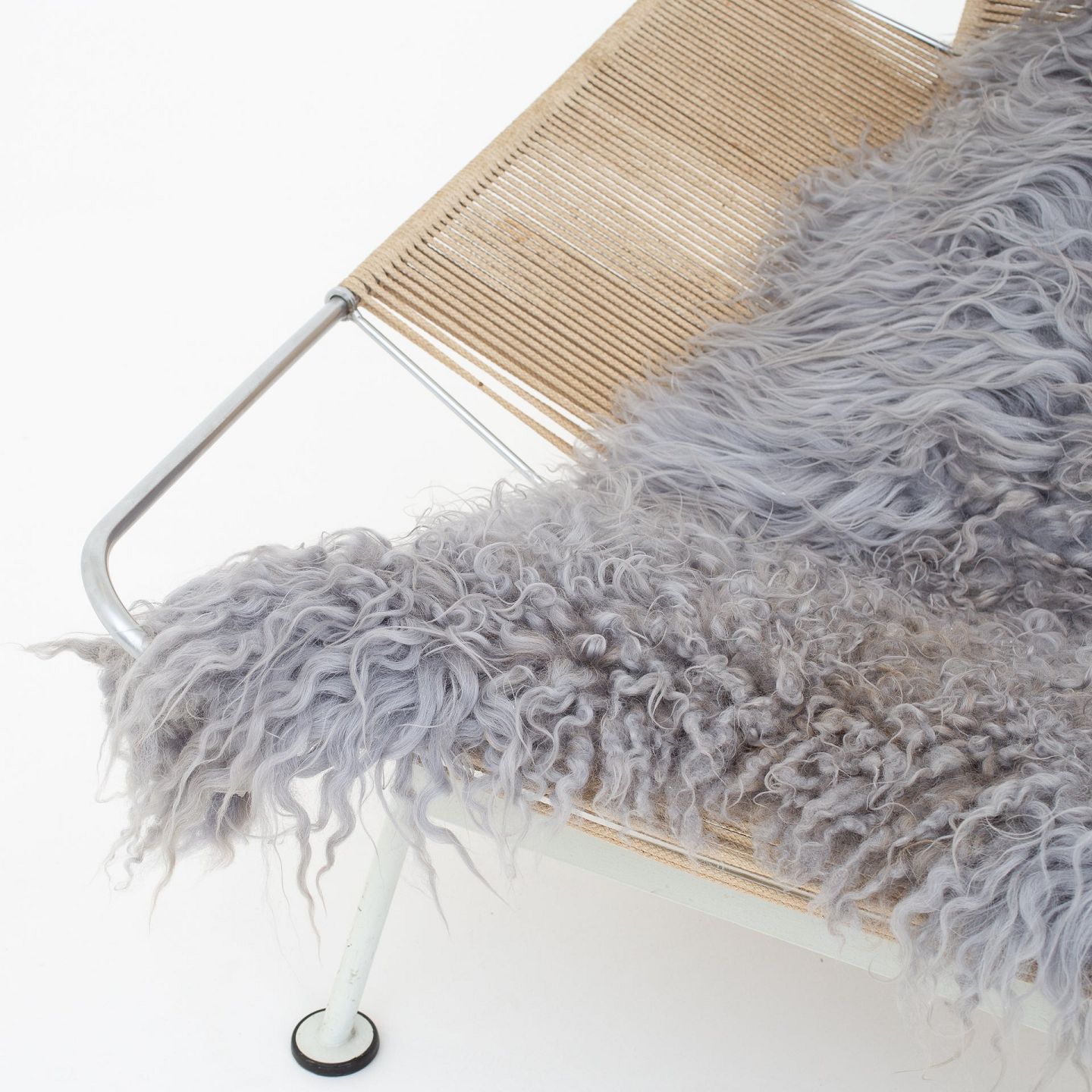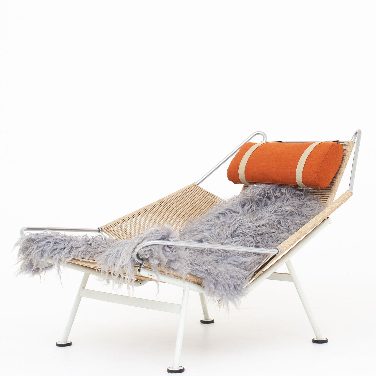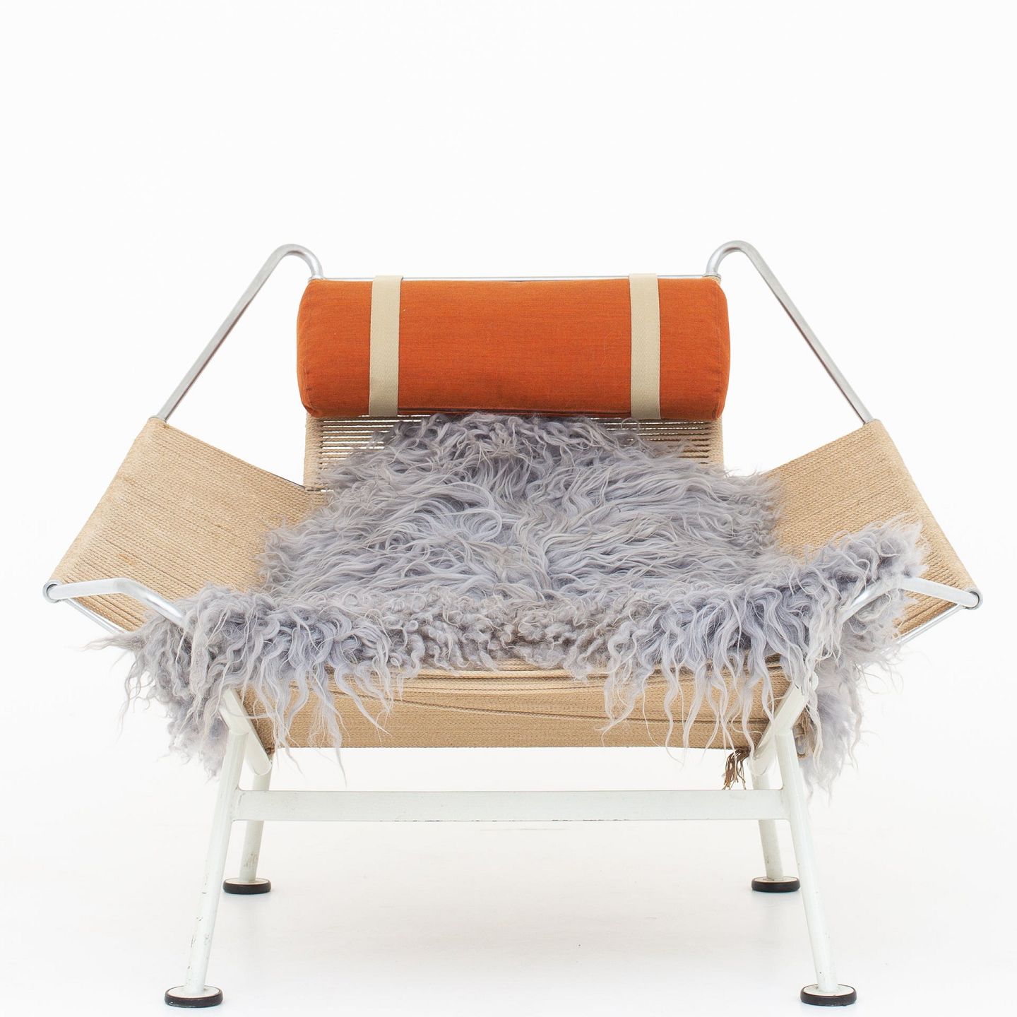 GE 225 - 'Flaglinestol' m. hvidt understel og original flagline samt nakkehynde.Dette er modelfoto. Udseendet på pude, lammeskind og patina kan variere. Kontakt os venligst for nøjagtige billeder af dette produkt.