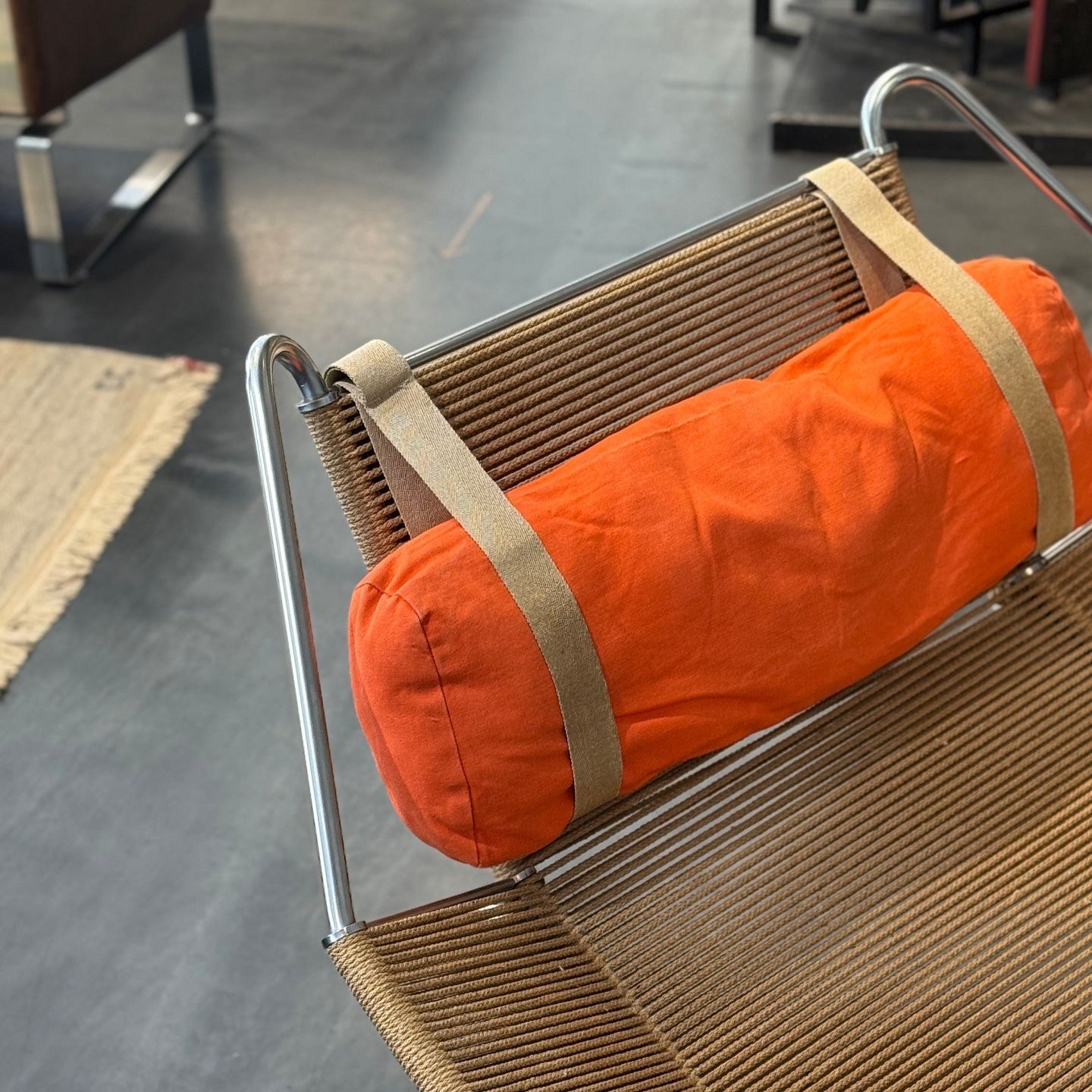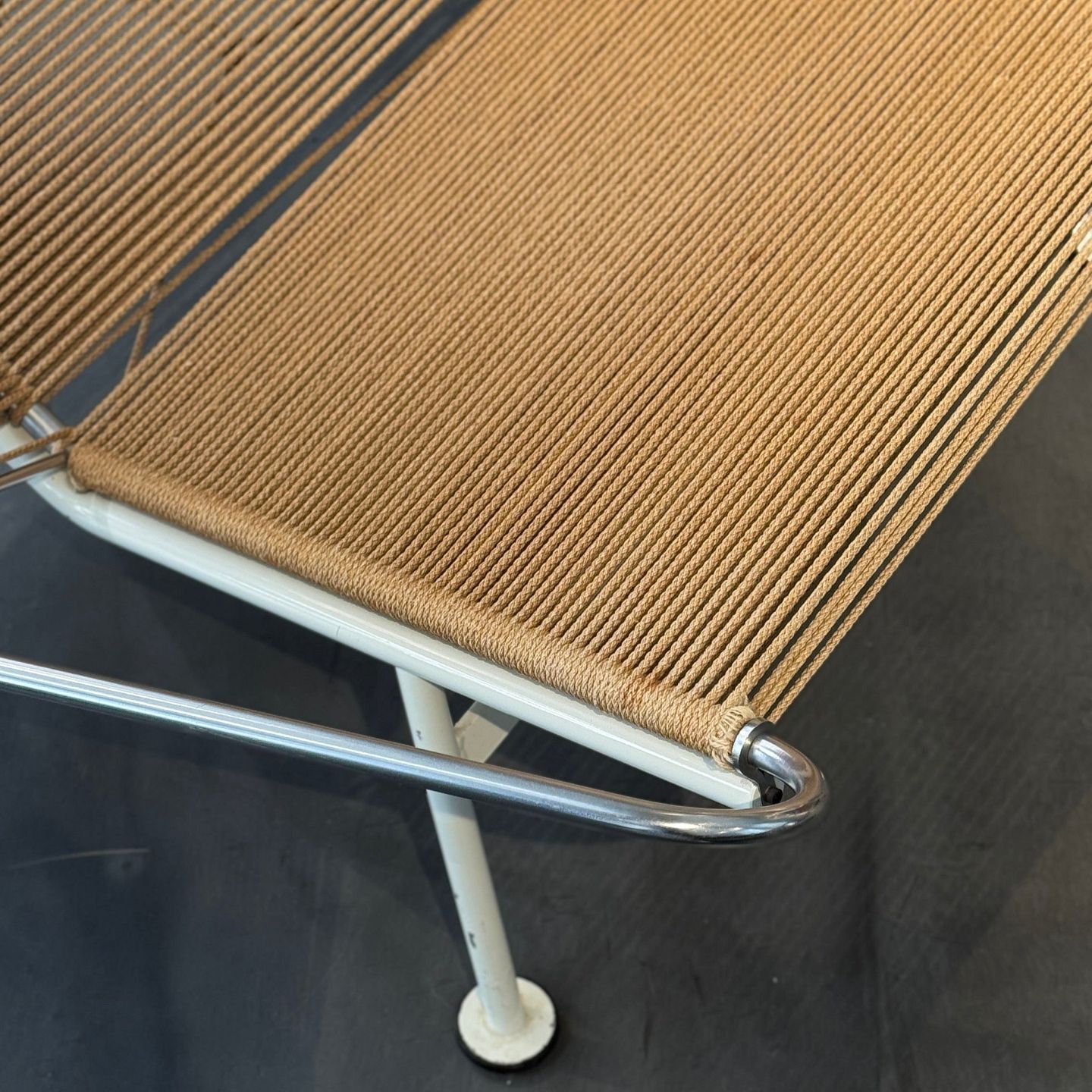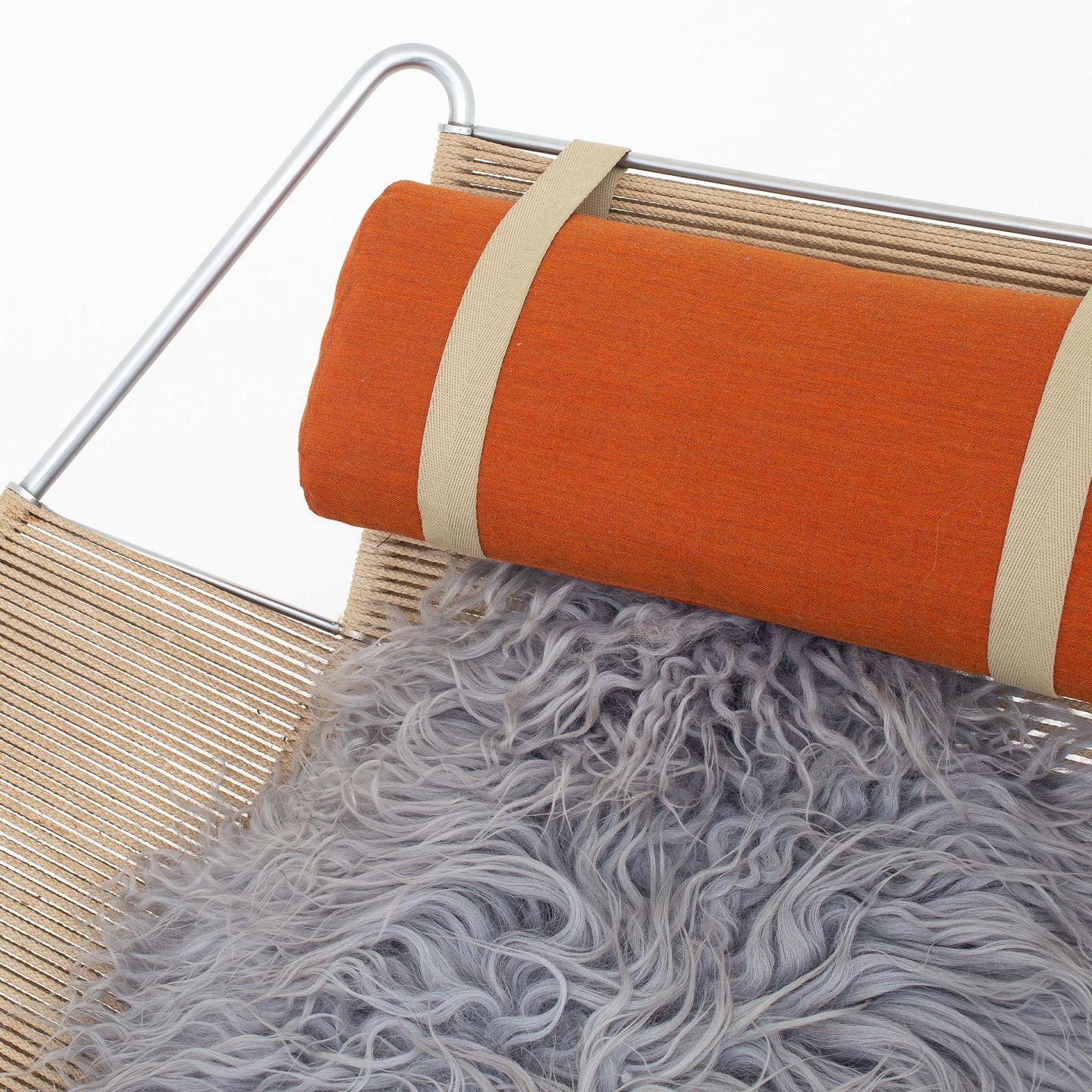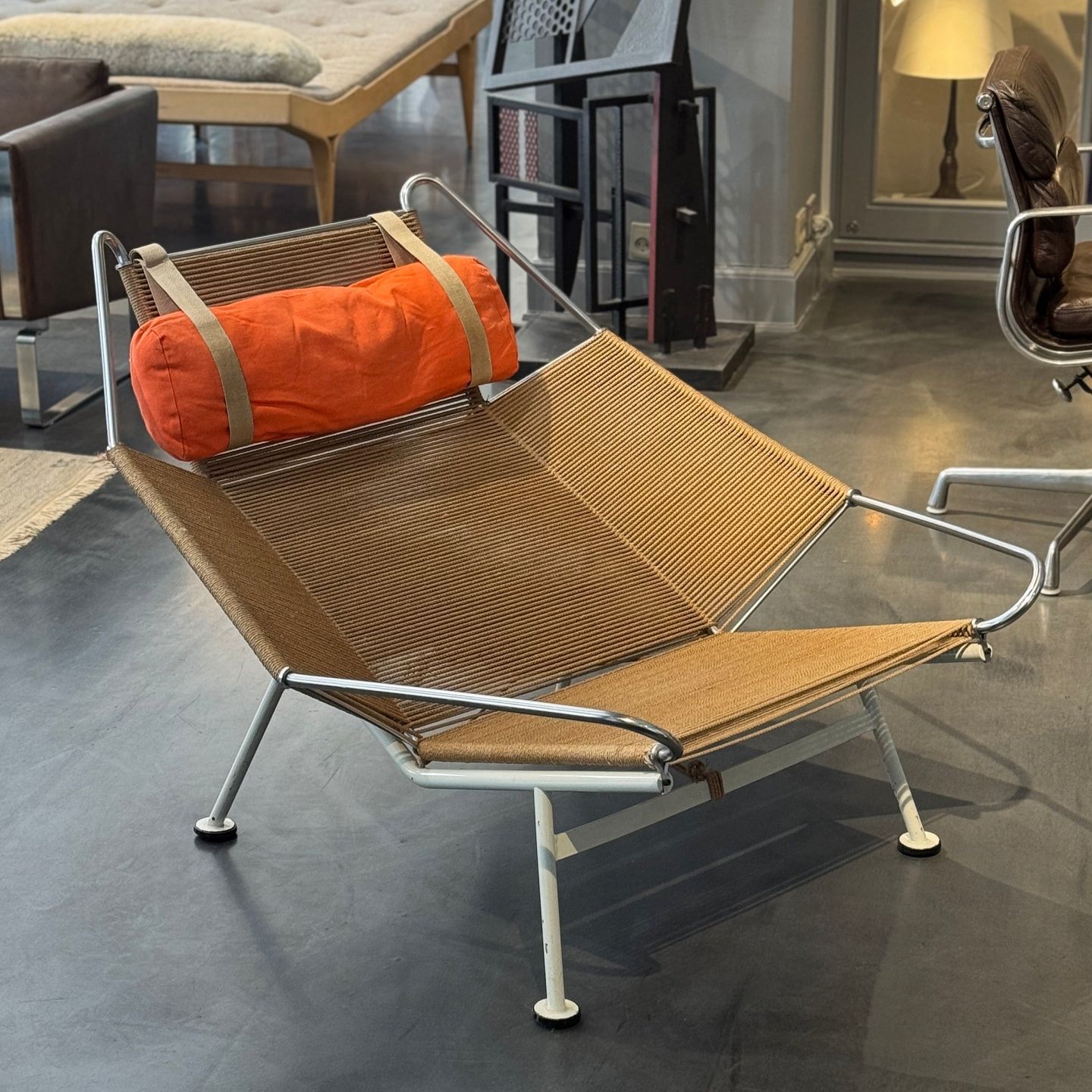 GE 225 - 'Flaglinestol' m. hvidt understel og original flagline samt nakkehynde.Dette er modelfoto. Udseendet på pude, lammeskind og patina kan variere. Kontakt os venligst for nøjagtige billeder af dette produkt.