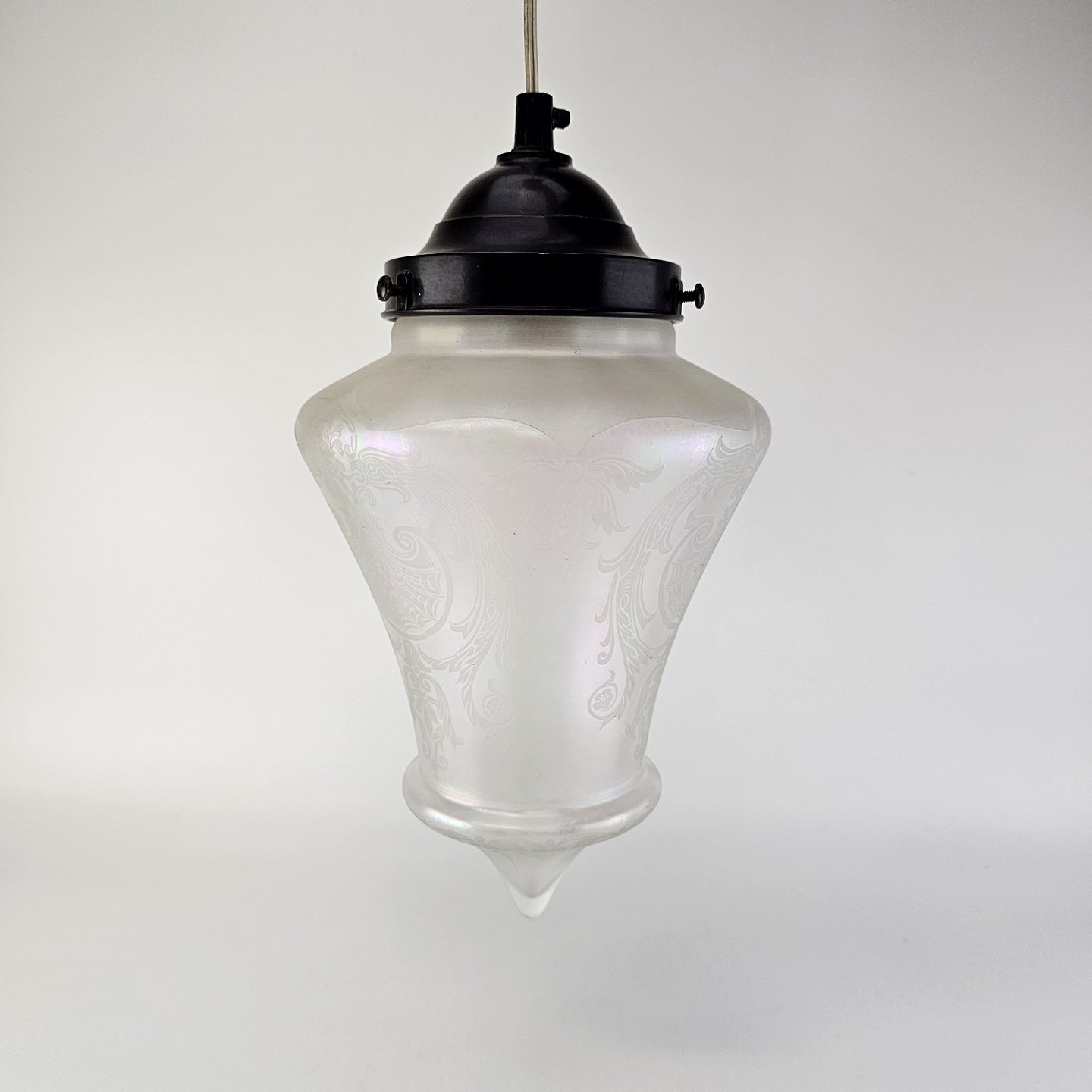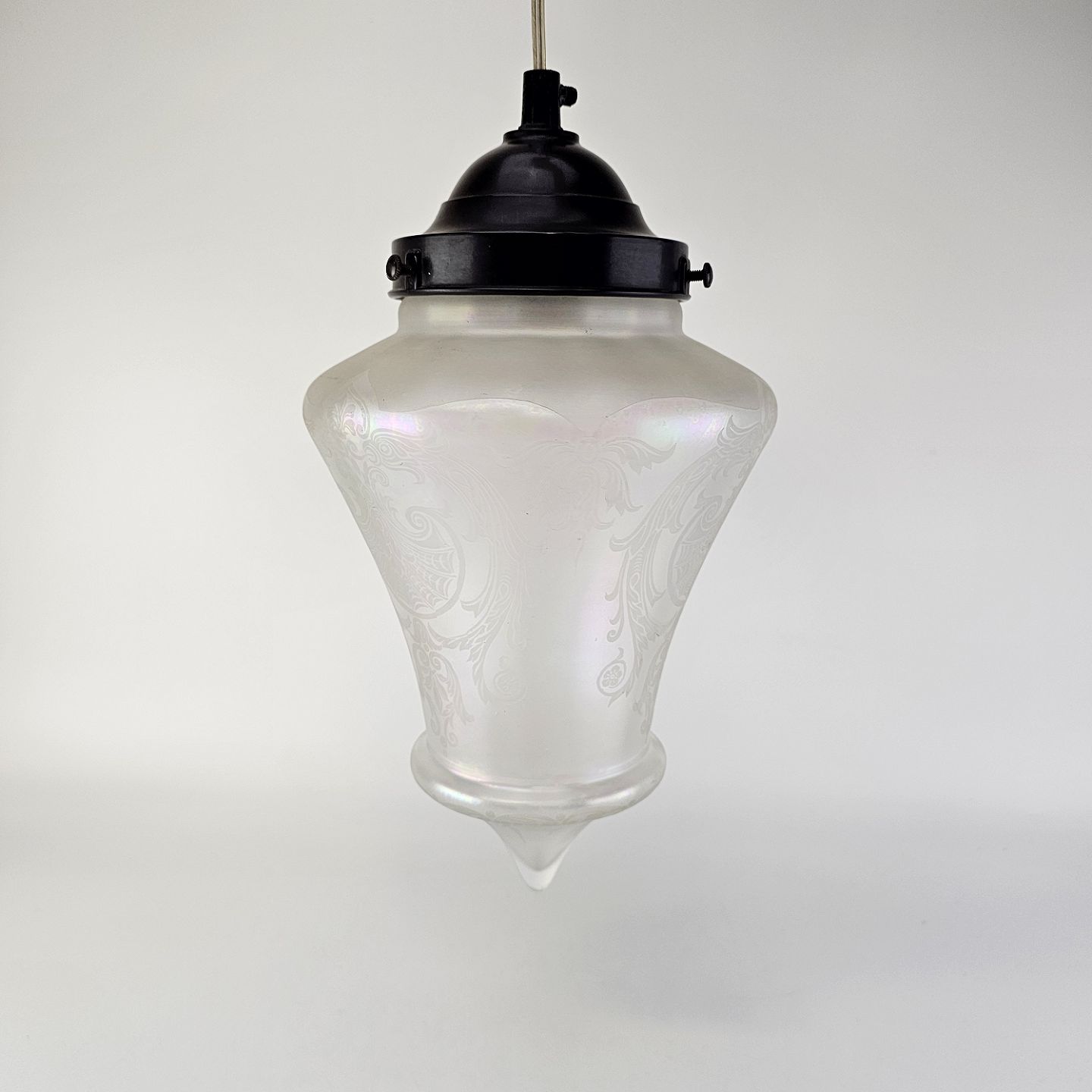 Pendel af matteret, iriserende glas med graveret mønsterHøjde 32 cm