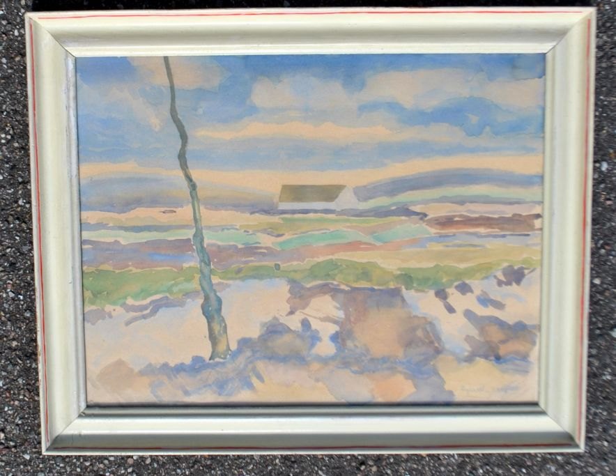 Finsk kunstner (20. årh): Et hus i et landskab. Akvarel. Signeret. 34 x 44 cm.Indrammet: 42 x 52 cm.