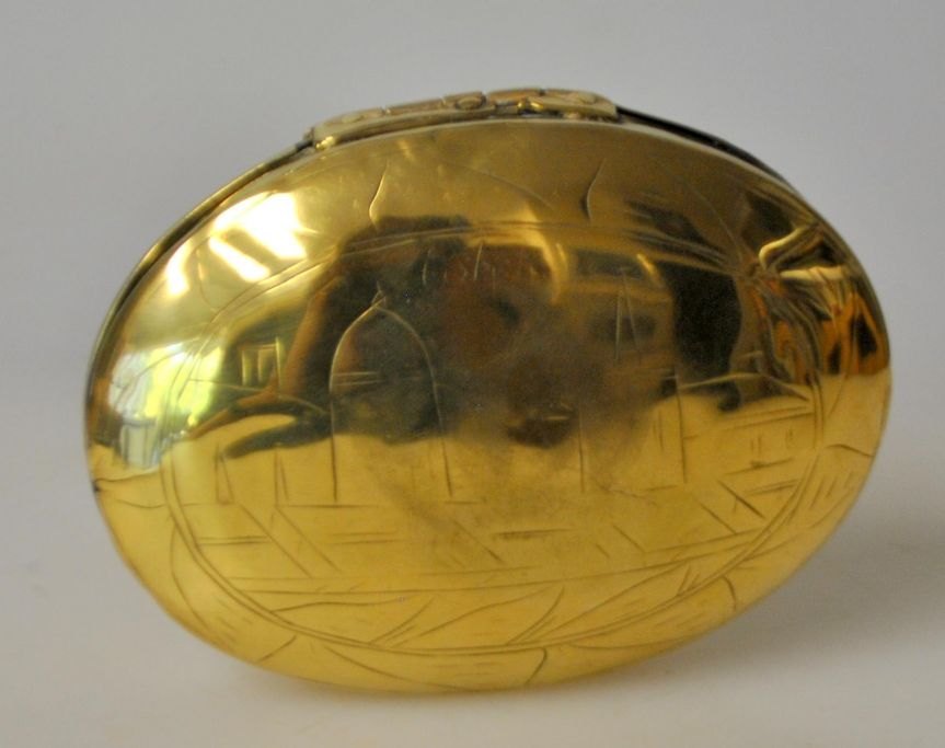 Hollandsk tobaksæske i messing, 1749. Med dekorationer i form af to kvinder og landskab med kirke. Oval med låg. Repareret. Med ejerinitialer og årstal.: 1749. L.: 11 cm.